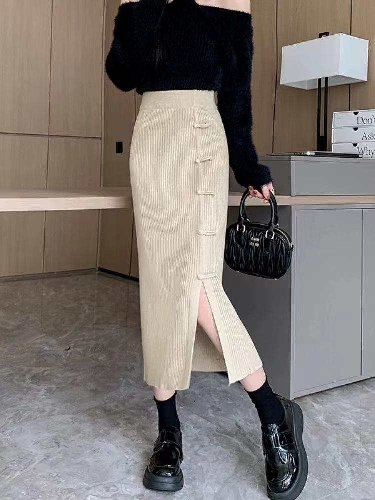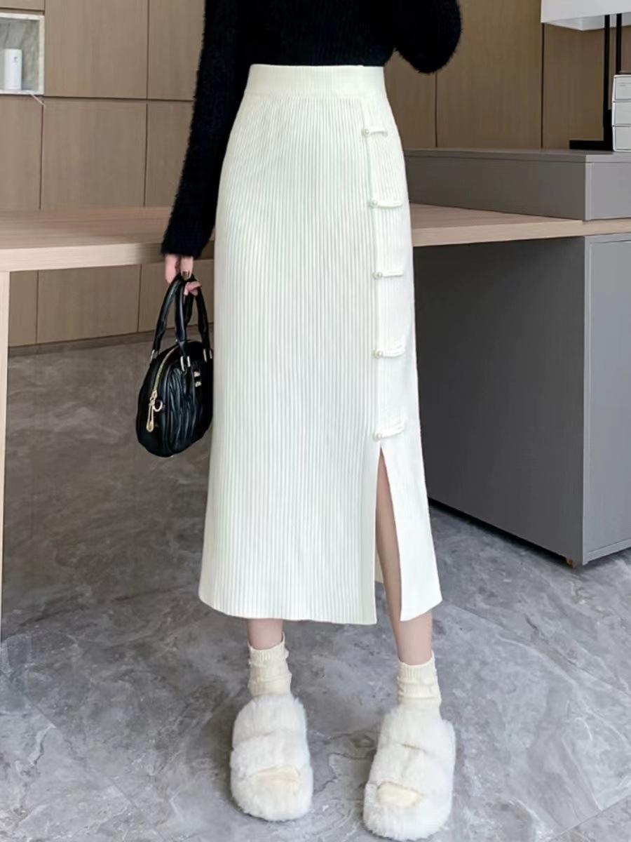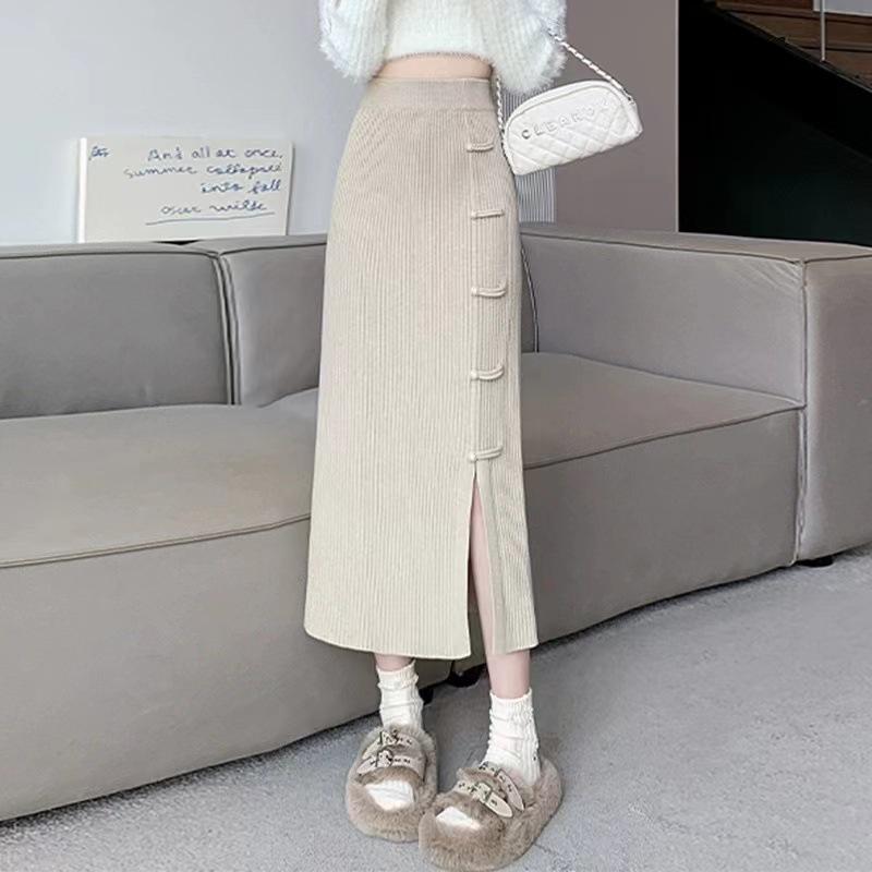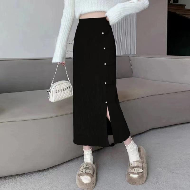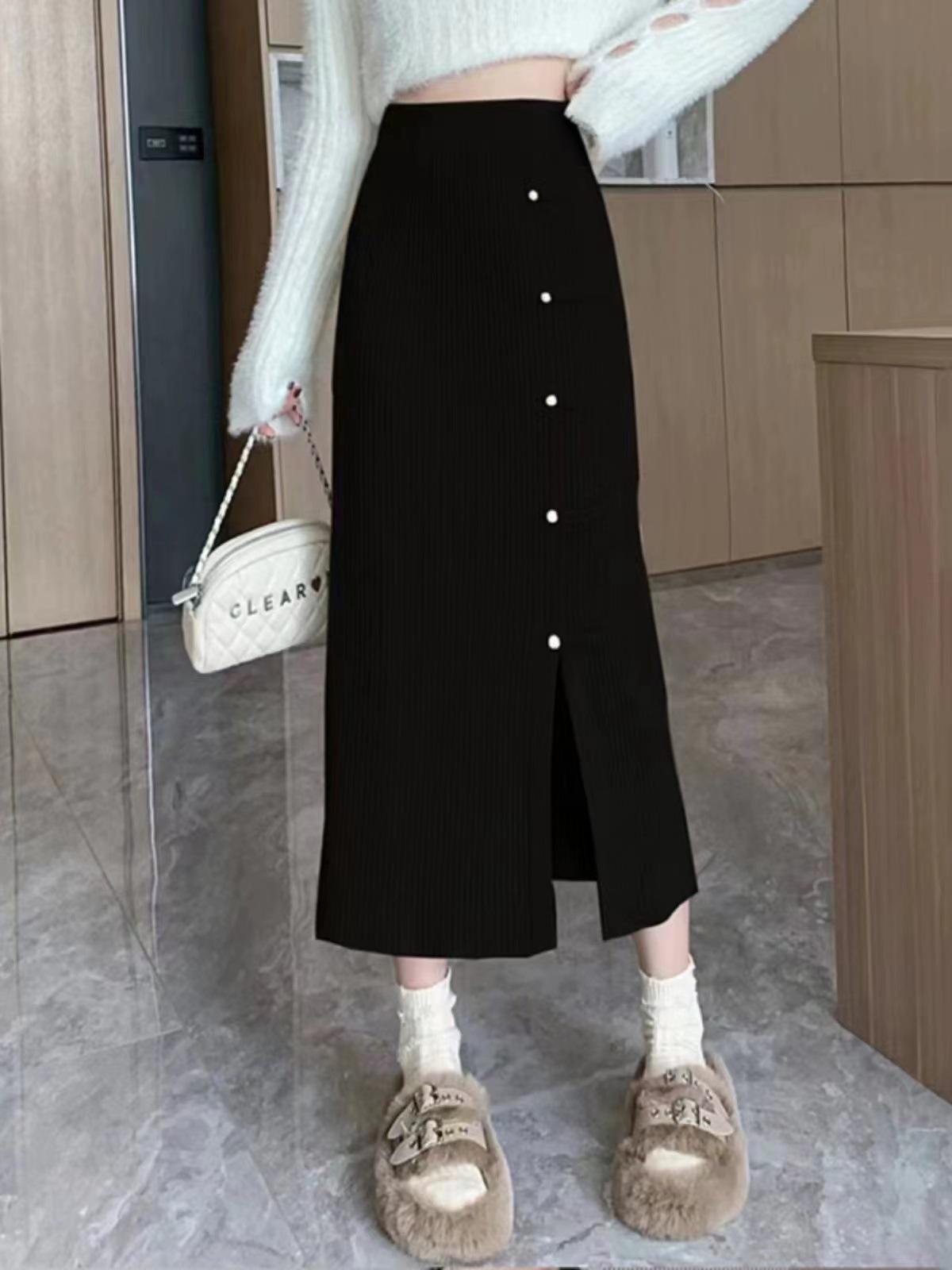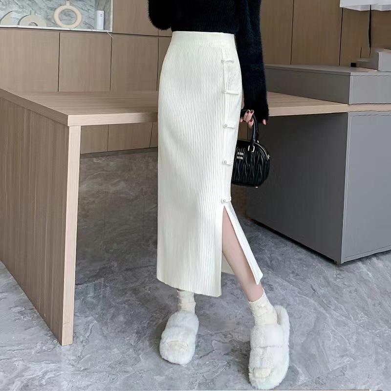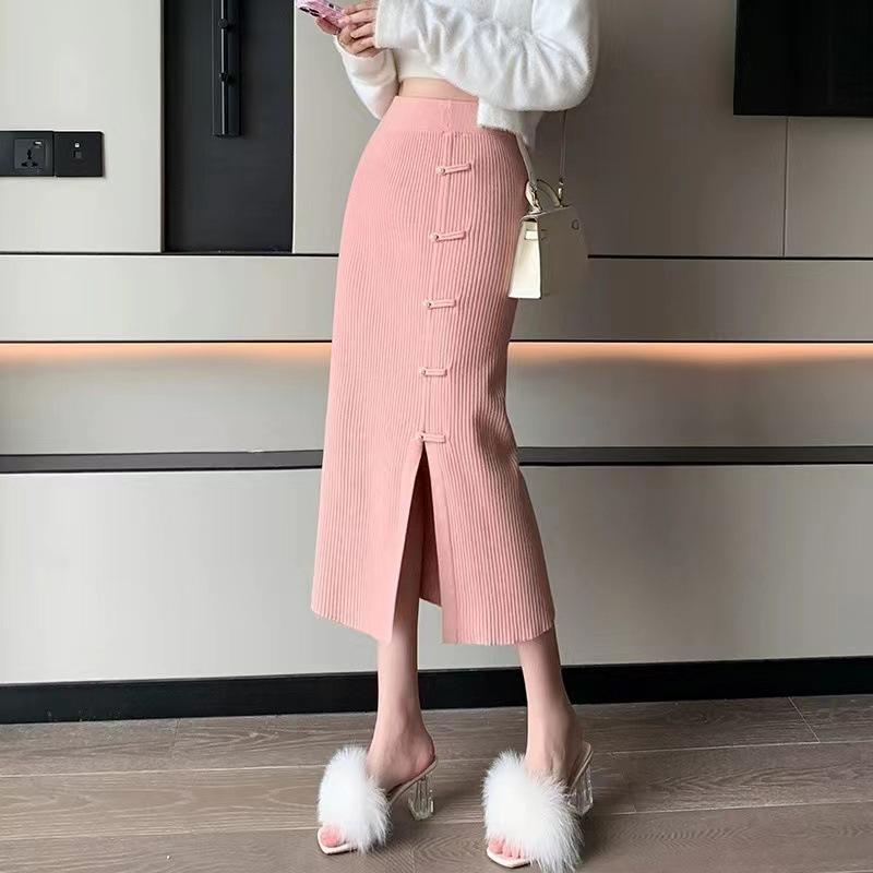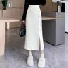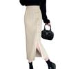 Compre Saia Tricotada para Mulheres Primavera, Outono e Inverno 2025 Nova Pequena Cintura Alta Linha A Cobre o Quadril Fenda Saia Midi no atacado no Joom.pro