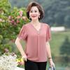 Camiseta de Verão de Manga Curta para Mãe Moda Estilo Ocidental Camisa de Chiffon Mulheres de 40 anos 50 anos Roupas de Seda Imitada Decote em V