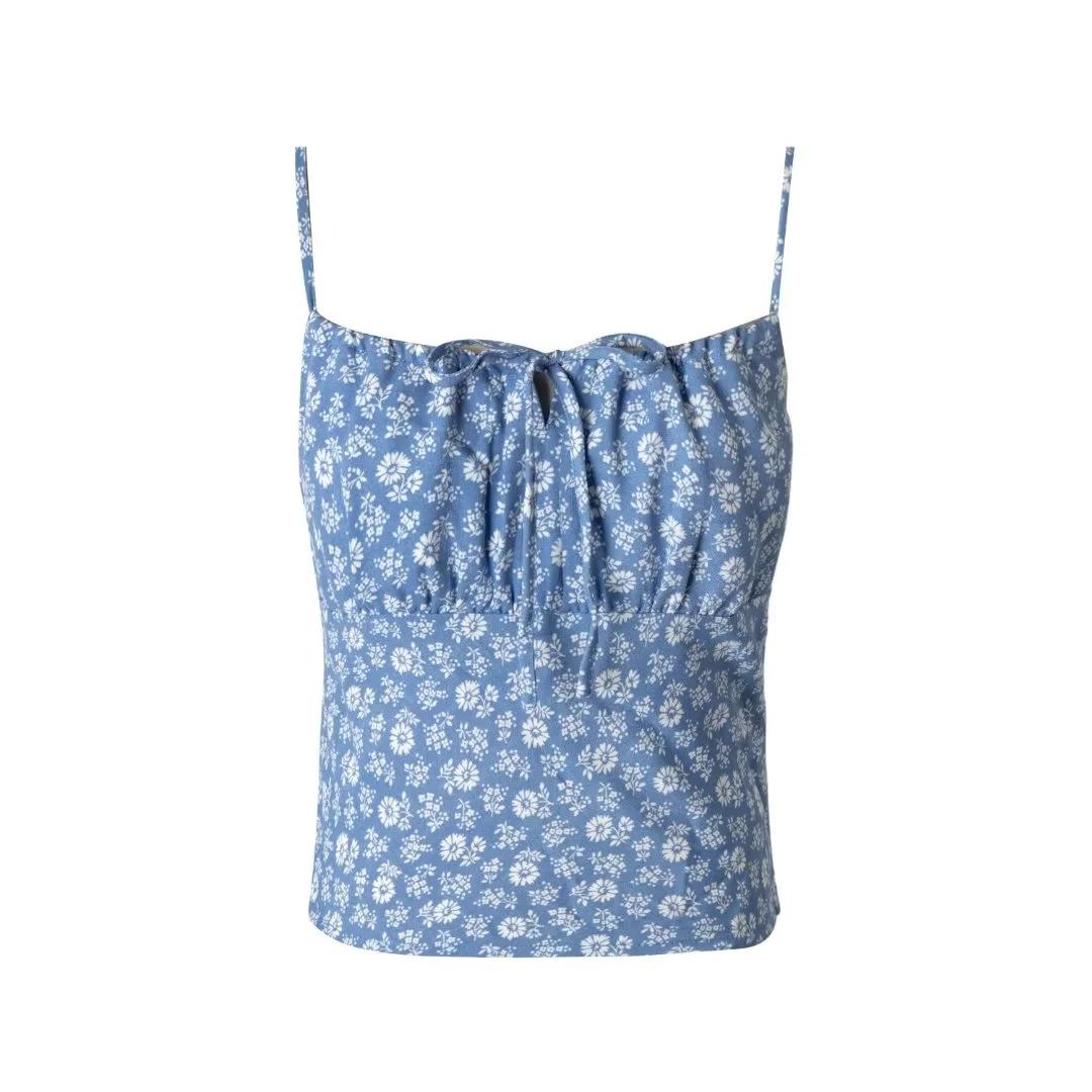 2024 Verão novo comércio exterior transfronteiriço estilo europeu e americano estampa floral laço renda-up slim alça top roupas femininas