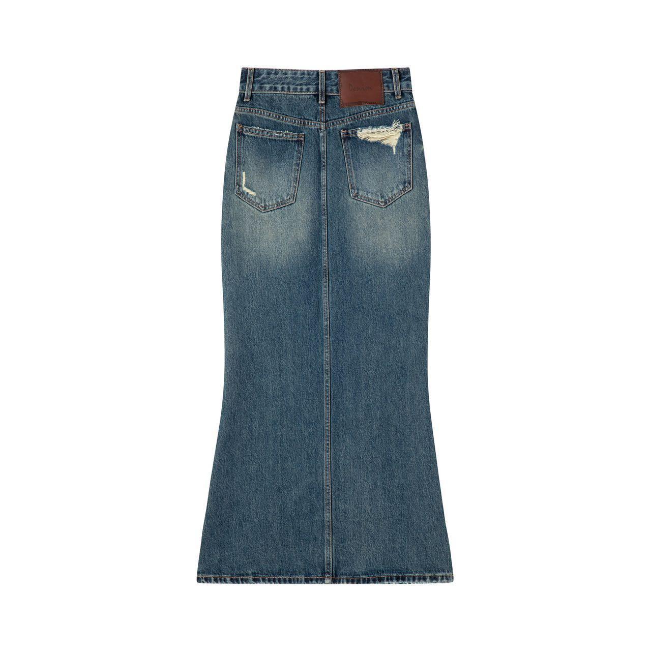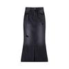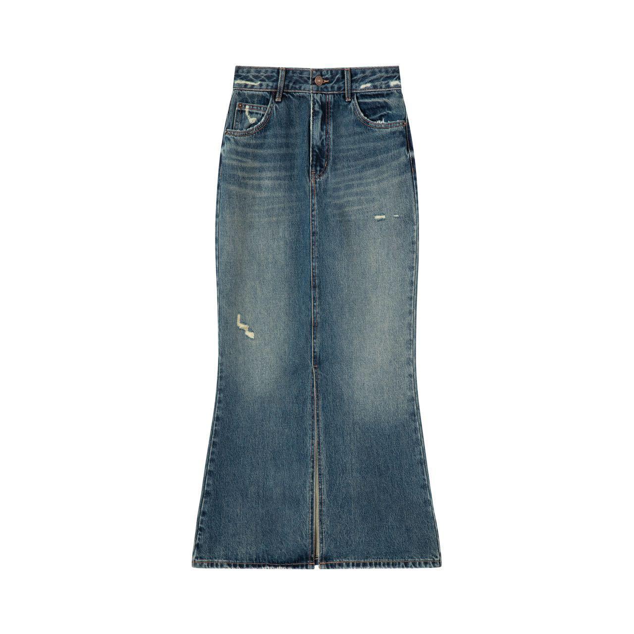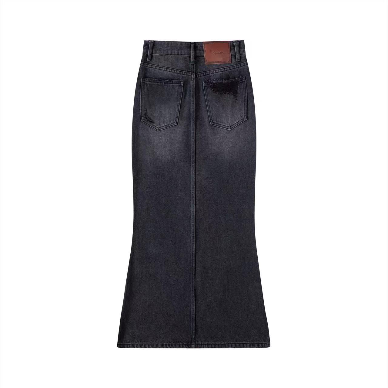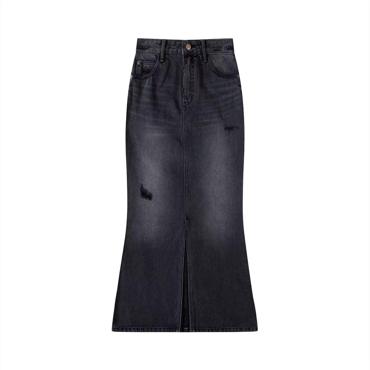 Saia Jeans Midi Feminina, Outono 2023, Fenda Cauda de Peixe Cintura Alta Justa, Ligeiramente Elástica, Novo Estilo Fashion