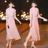 Leite de mamão verão novo estilo coreano elegante emagrecimento chiffon vestido super fada de duas peças floral de manga curta vestido longo