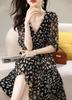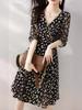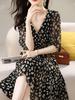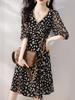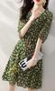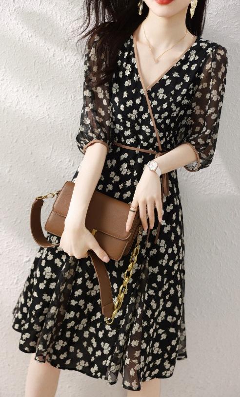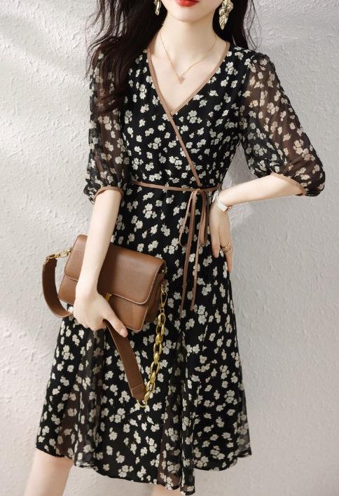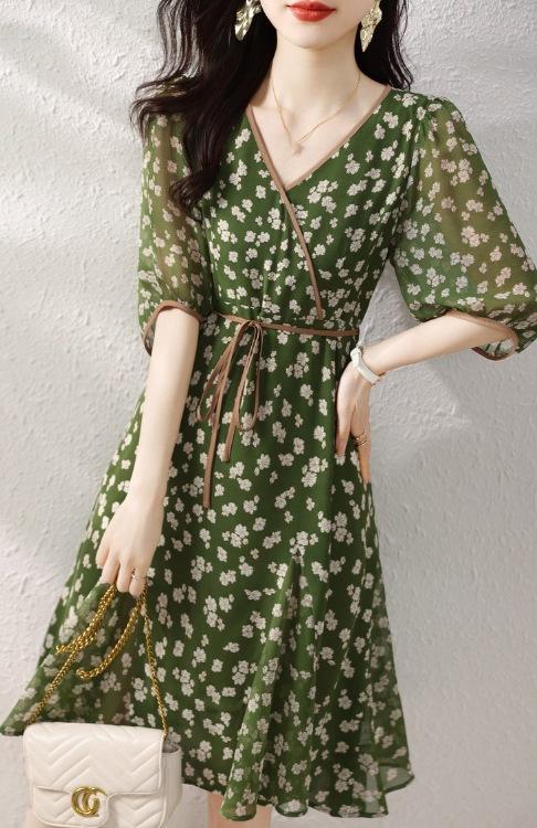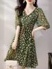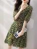 Vestido Suave com Estampa Chiffon 2024 Verão Novo plus size Decote V Apertado Cintura Vestido Manga Feminina Comprimento Médio
