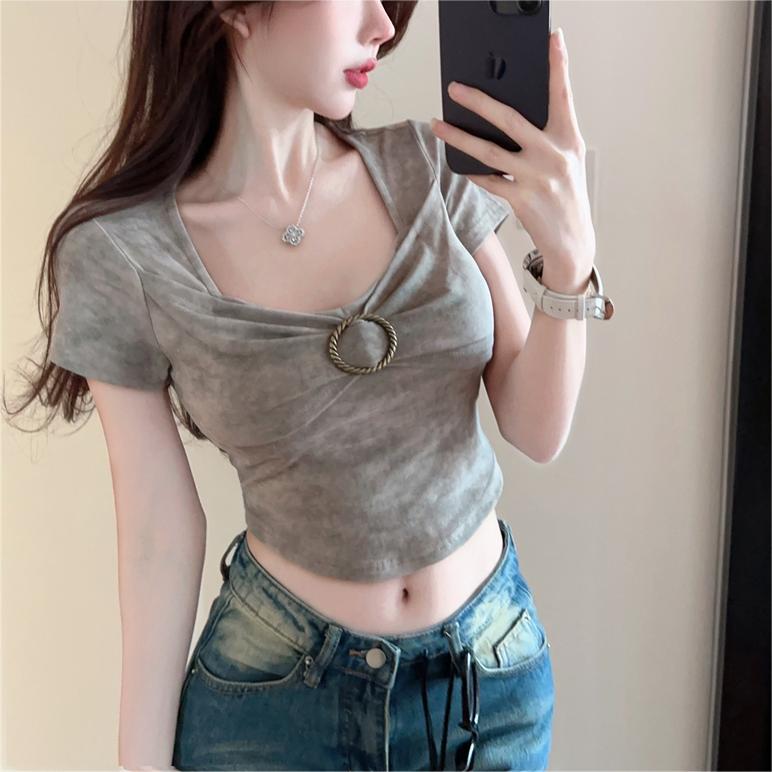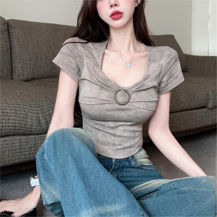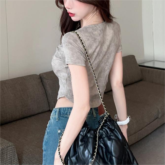 Compre Verão Novo Estilo Puro Francês Tie-Dye Square Collar T-shirt Feminino Verão Slim-fit Short-sleeved Hot Girl Short Top Feminino no atacado no Joom.pro