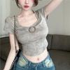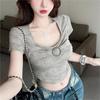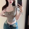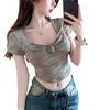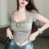 Verão Novo Estilo Puro Francês Tie-Dye Square Collar T-shirt Feminino Verão Slim-fit Short-sleeved Hot Girl Short Top Feminino