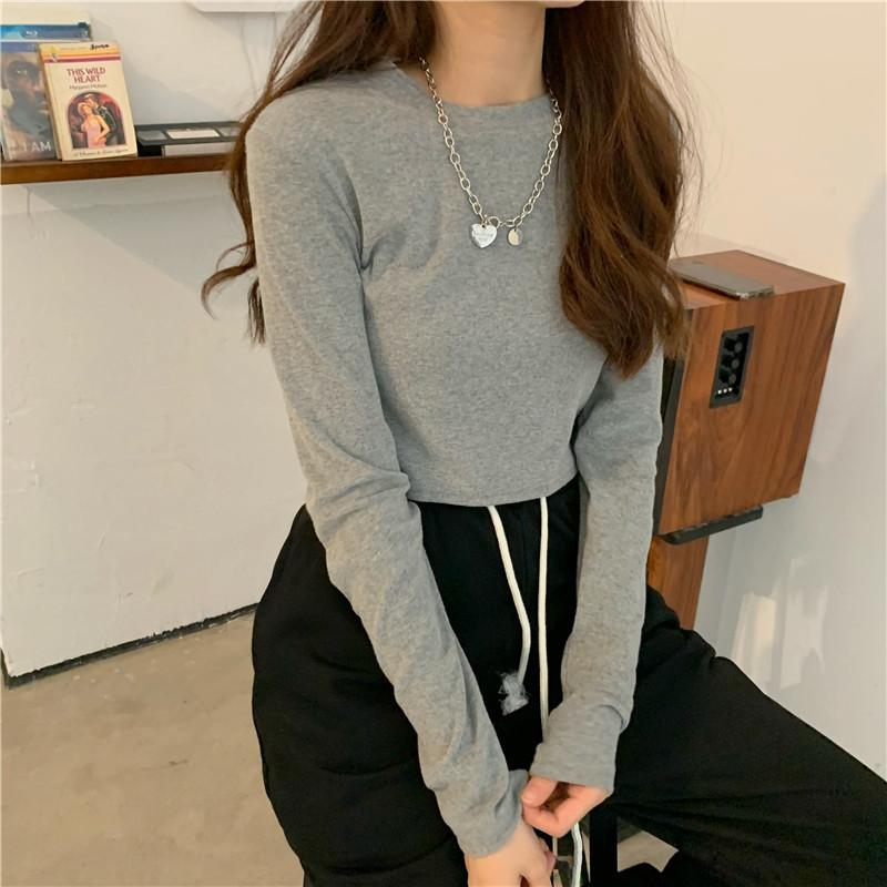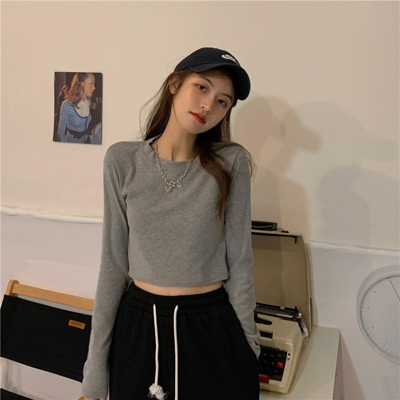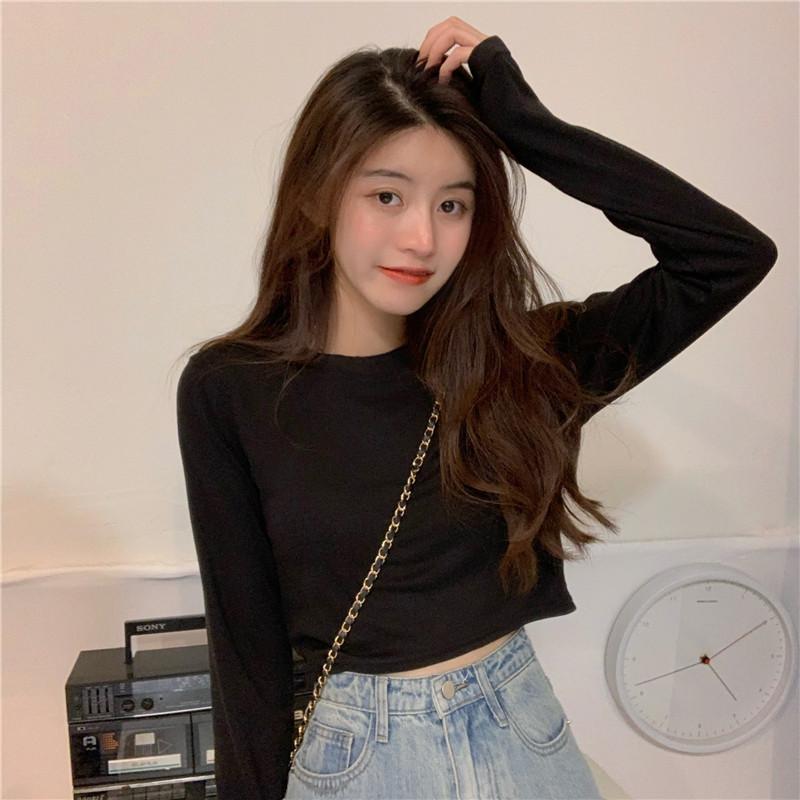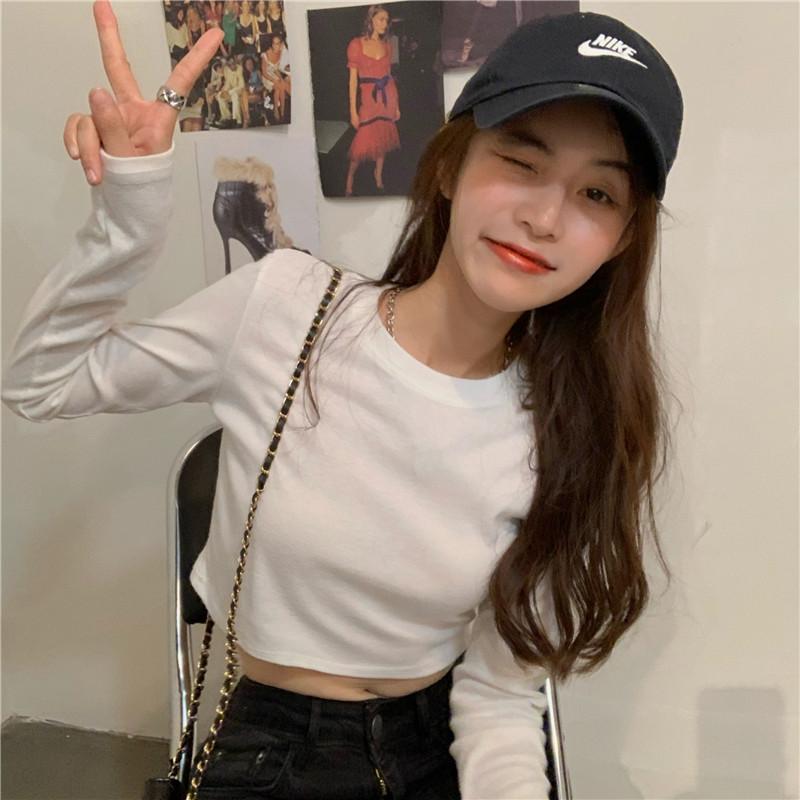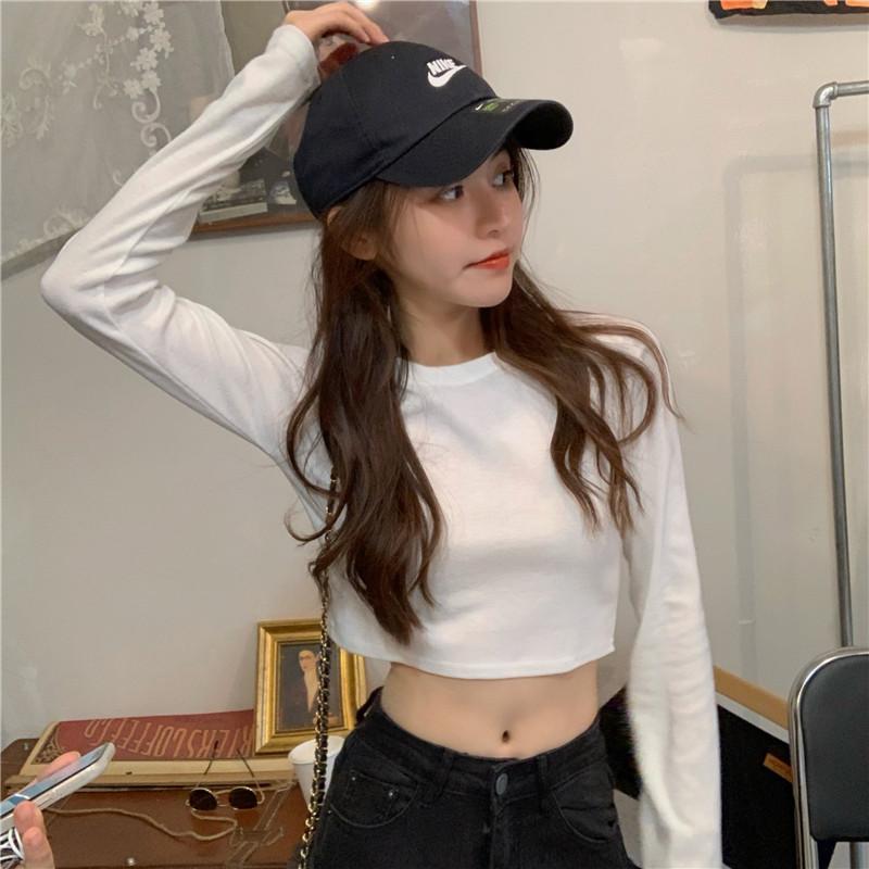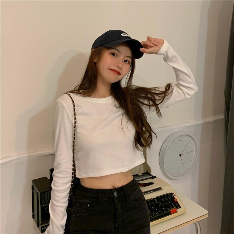 Compre Camiseta Básica Branca de Manga Longa, Top Cropped Curto Estilo Coreano, Blusa Feminina Slim-Fit Modeladora para Outono 2025 no atacado no Joom.pro