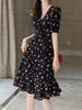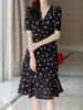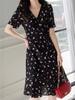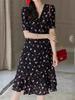 Planta Feminina 2024 Verão V-neck Seda Crepe-in-Chine Doce Saia Floral Vestido Cordão Mulheres Vestido de comprimento médio
