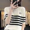 Suéter Feminino de Algodão Listrado de Manga Curta com Gola Redonda Feminino 2024 Verão Novo Slim Manga 3/4 Tricotado Top Feminino