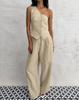 2025 Verão Novo Moda Europeia e Americana para o Dia a Dia Cáqui Ombro a Ombro Algodão e Linho Colete Calças Conjunto de Duas Peças Atacado Roupas Femininas
