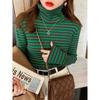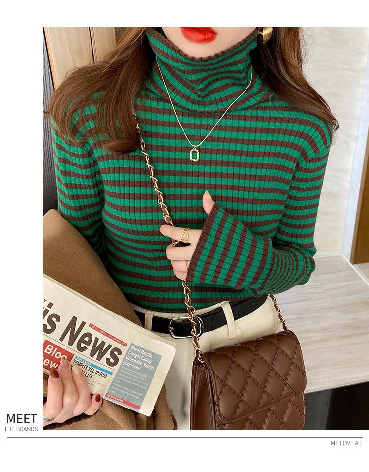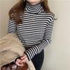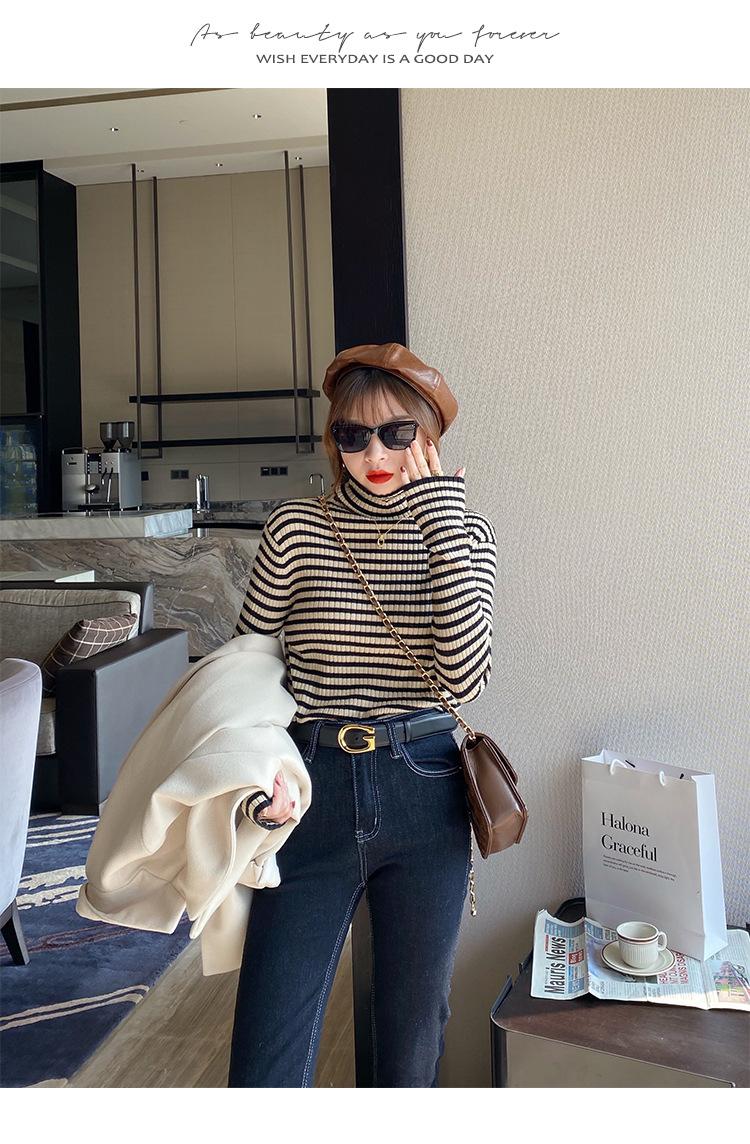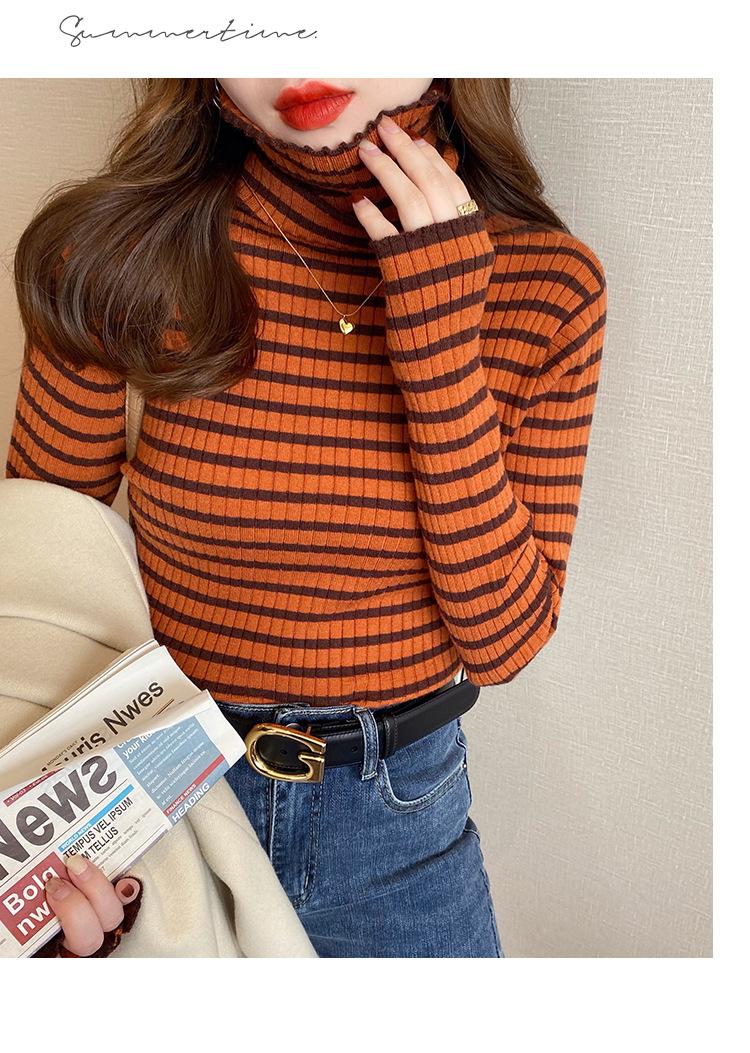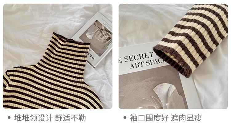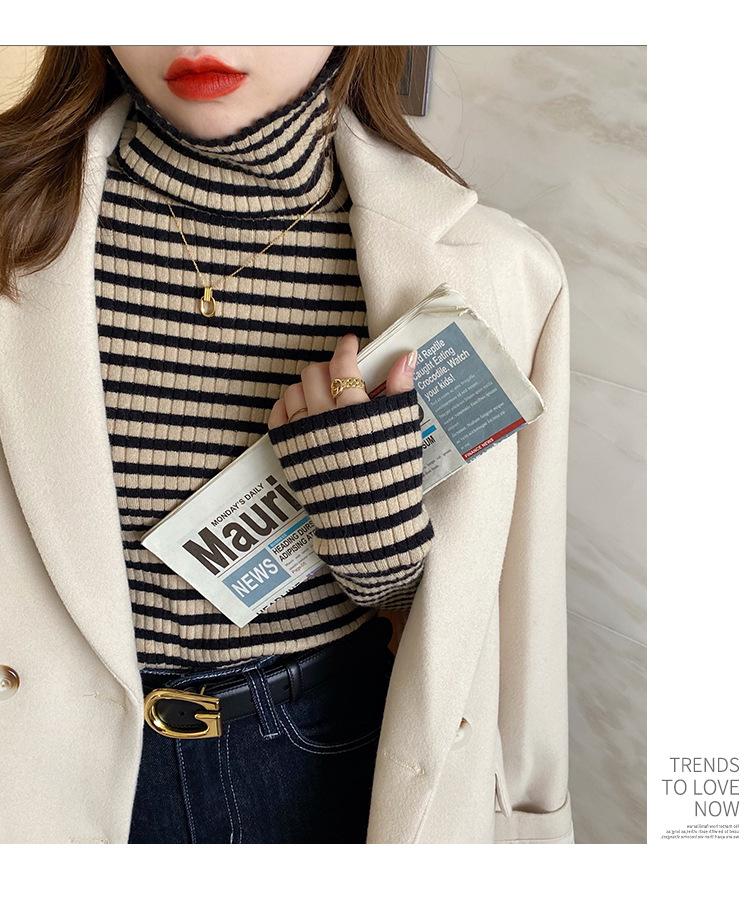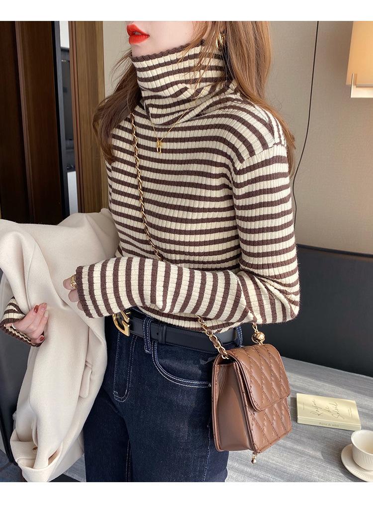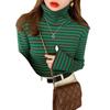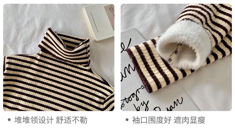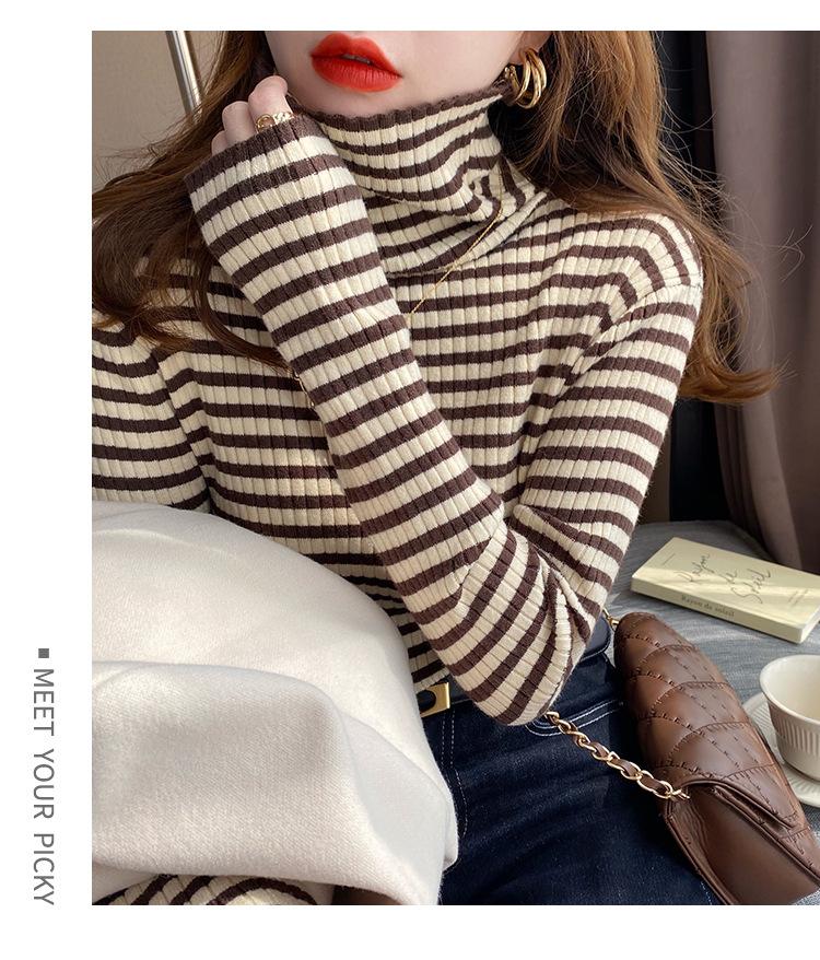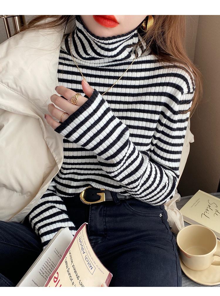 Camiseta Listrada de Gola Alta para Outono e Inverno, Camada Interna Estilosa com Veludo, Popular 2024 Novo Suéter Versátil Top Tricotado