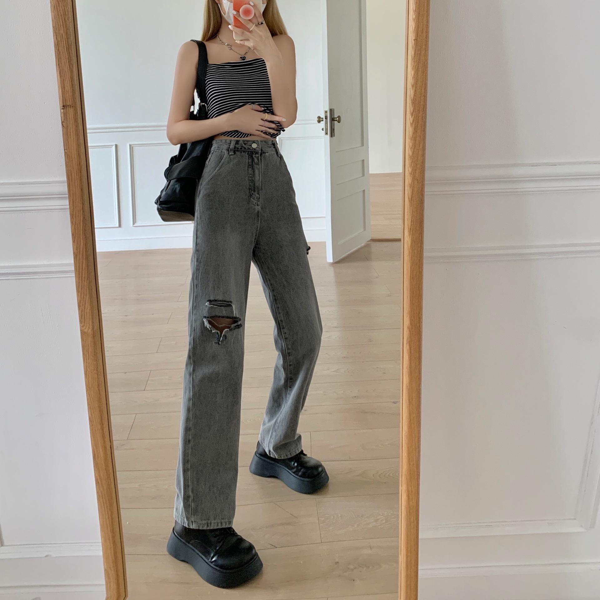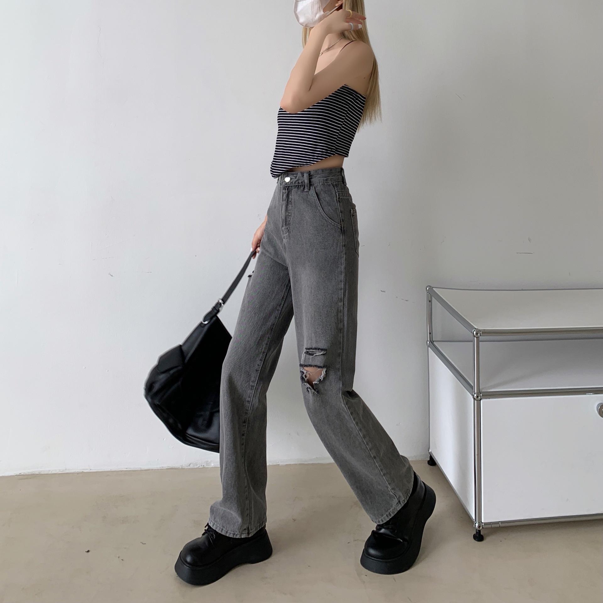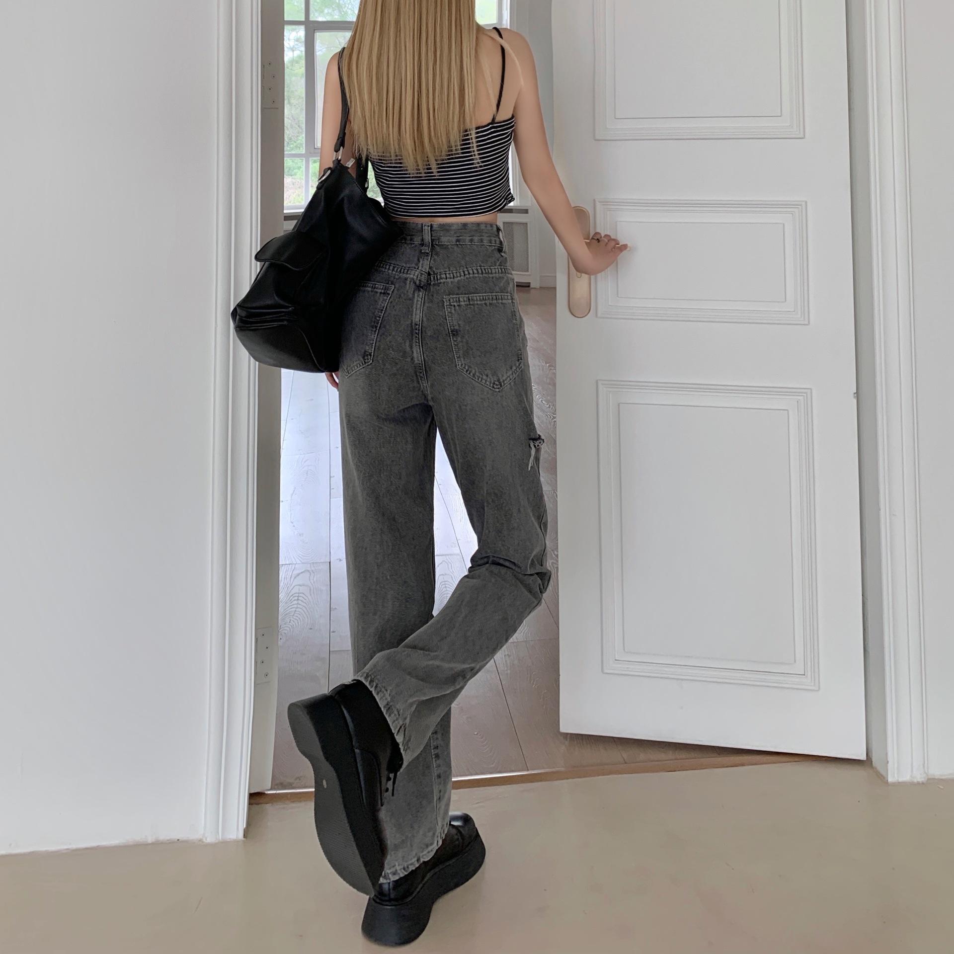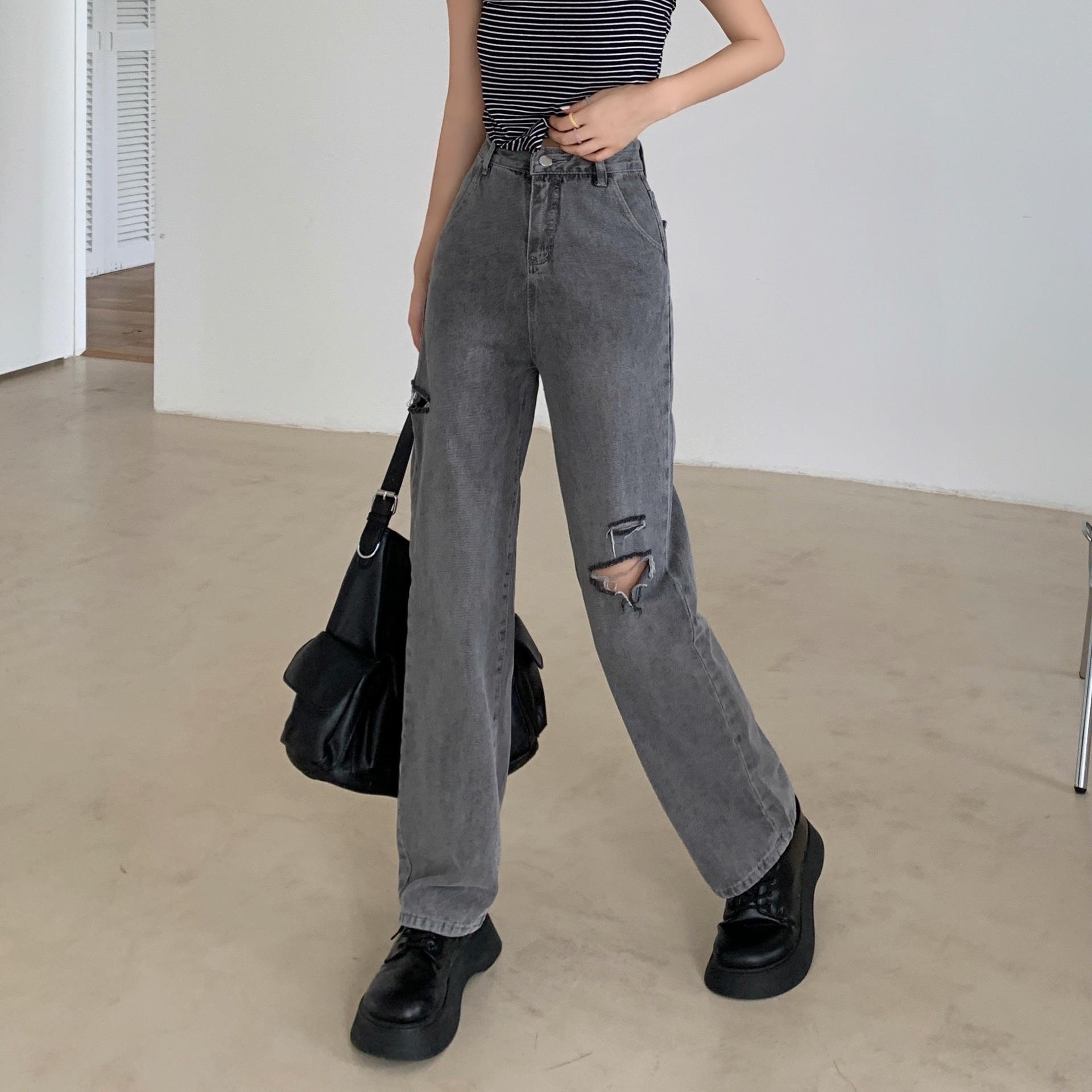 Compre Jeans Cinza Fumaça para Mulheres no Outono Novo Estilo Retrô Cintura Alta Solto Modelador Look Rasgado Reto Calças de Perna Larga no atacado no Joom.pro