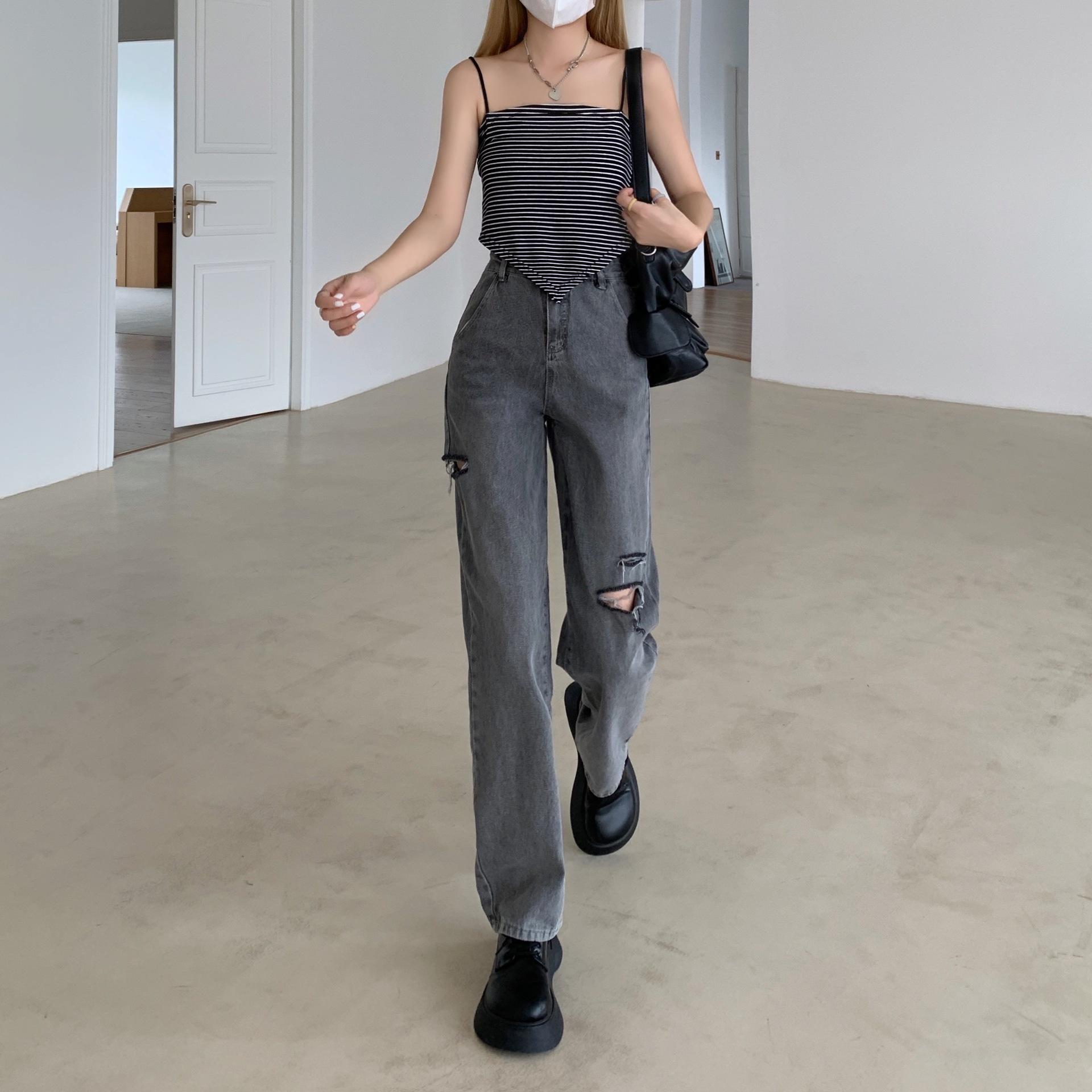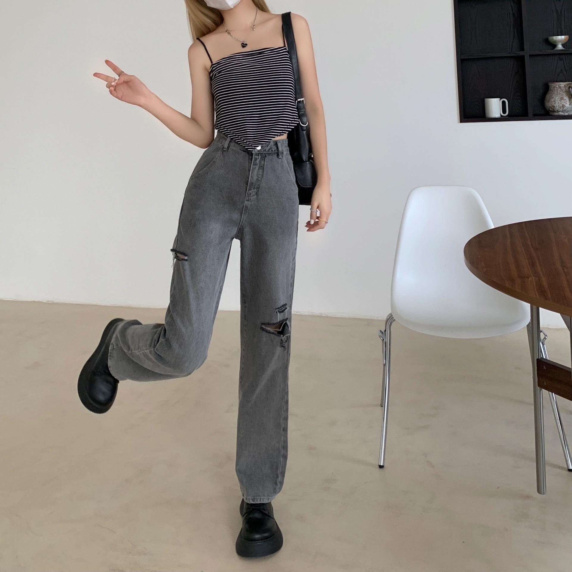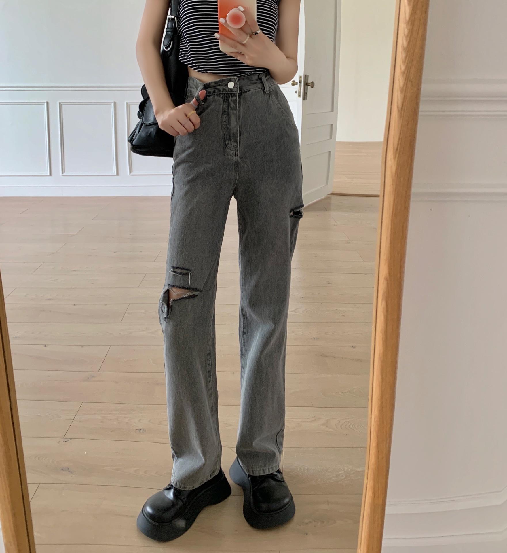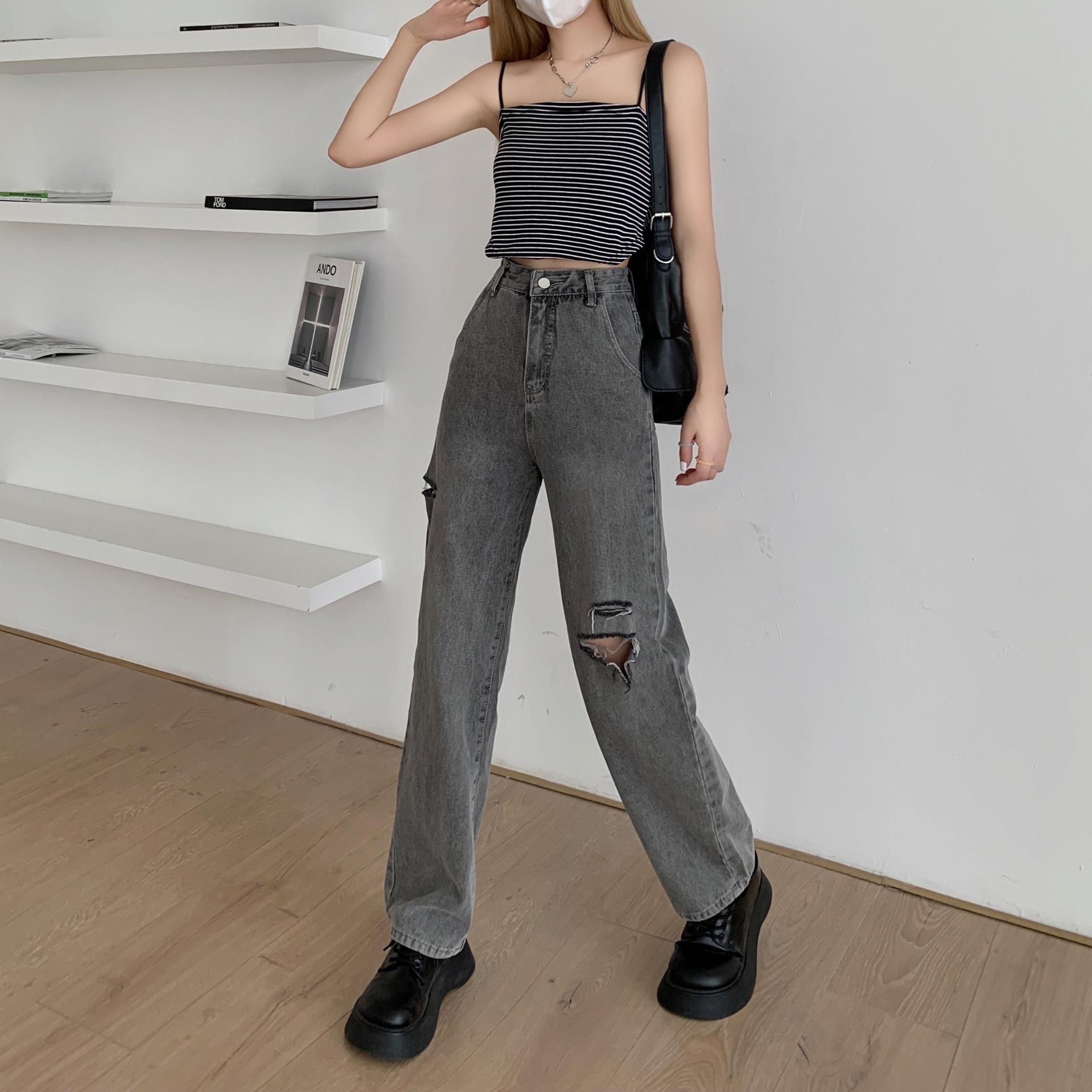 Compre Jeans Cinza Fumaça para Mulheres no Outono Novo Estilo Retrô Cintura Alta Solto Modelador Look Rasgado Reto Calças de Perna Larga no atacado no Joom.pro