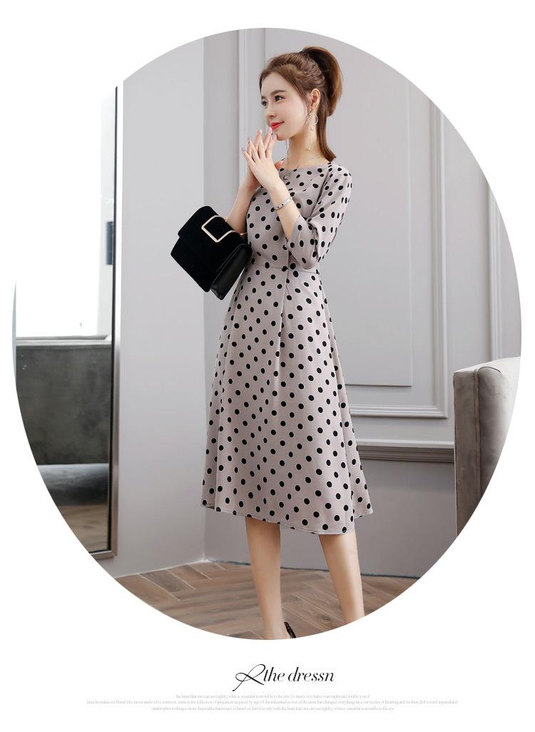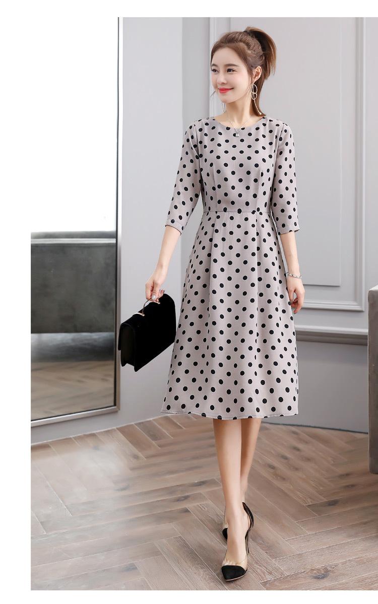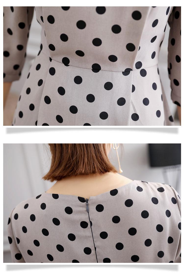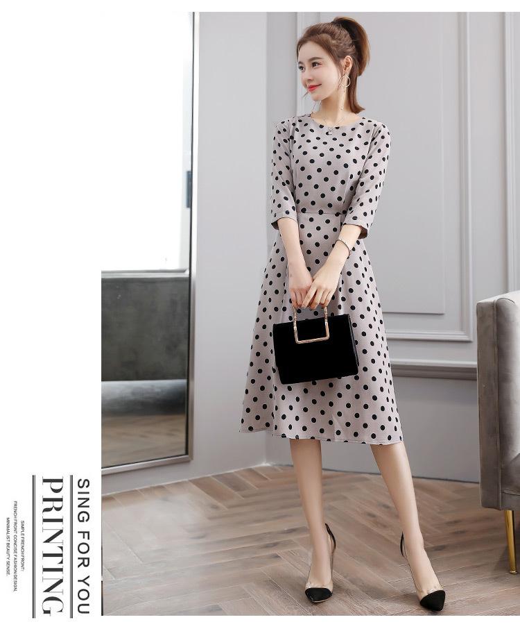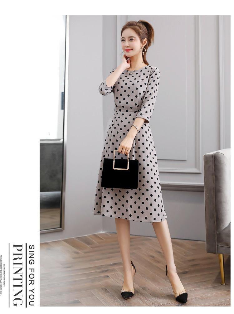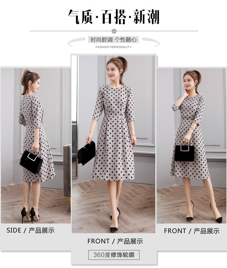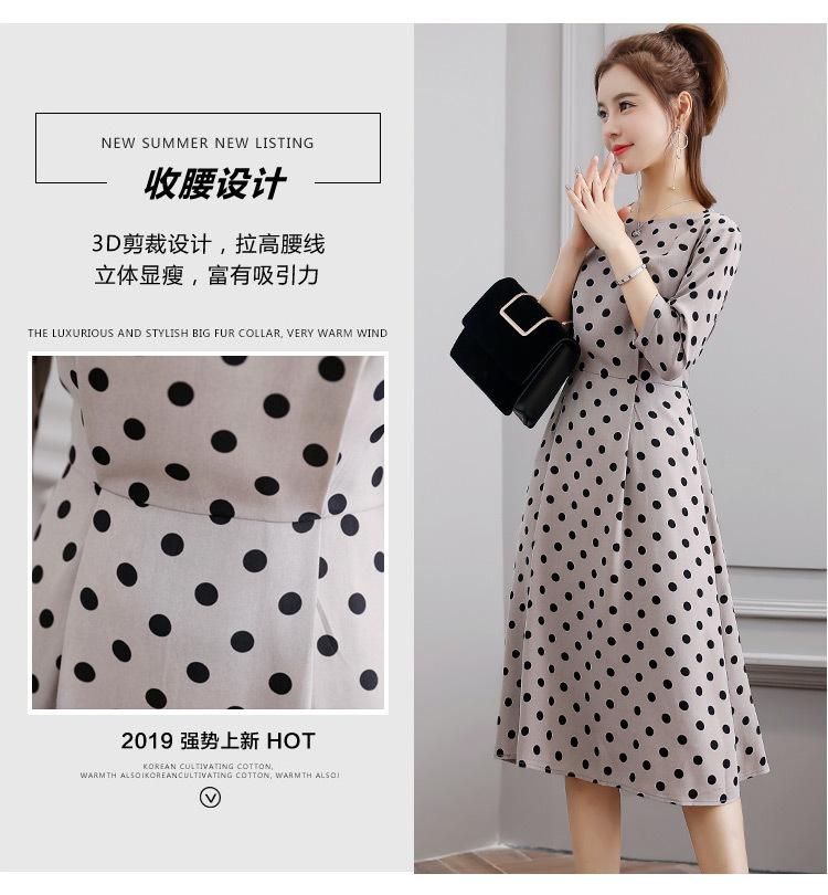 Leite de mamão primavera e verão novo estilo coreano elegante cintura apertada emagrecimento pescoço redondo moda sete mangas polka dot mid-length vestido