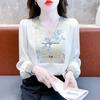 Primavera Nova 2020V colarinho manga comprida novo estilo chinês camisa estampada Moda feminina temperamento placa fivela chiffon camisa top moda