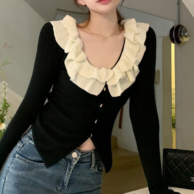 Chanel estilo listrado colarinho babado preto manga comprida pullover slim fit costura emagrecedora início de outono design suéter para as mulheres