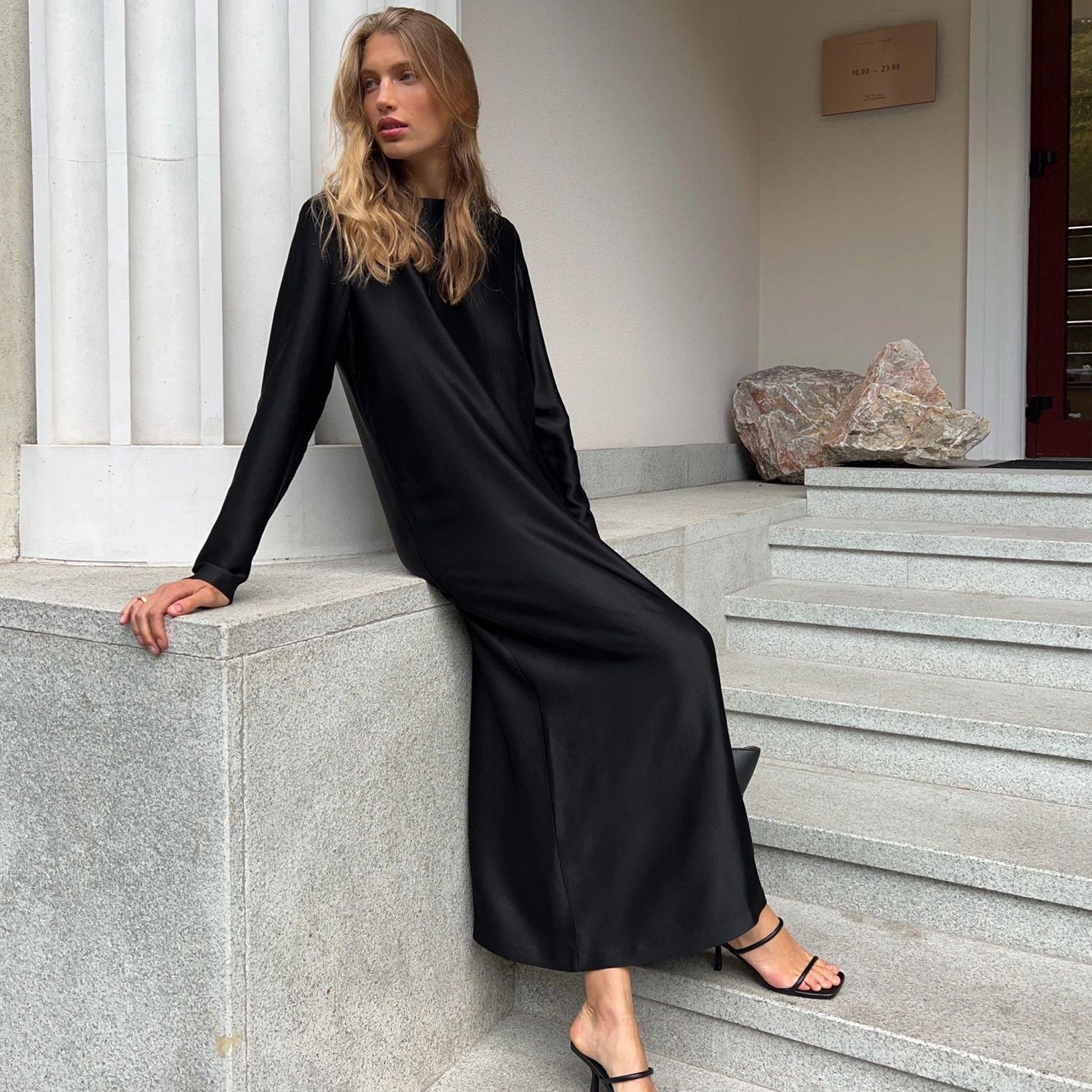 Vestido Base da Moda Europeia e Americana Outono e Inverno 2025, Vestido Longo Bodycon Drapeado de Cetim Fendado de Manga Longa Fashion