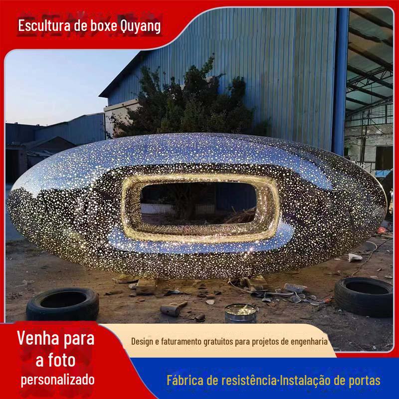 Grande escultura oca de aço inoxidável luminosa oval bola criativa banco quadrado de metal escultura de rua comercial de aço inoxidável