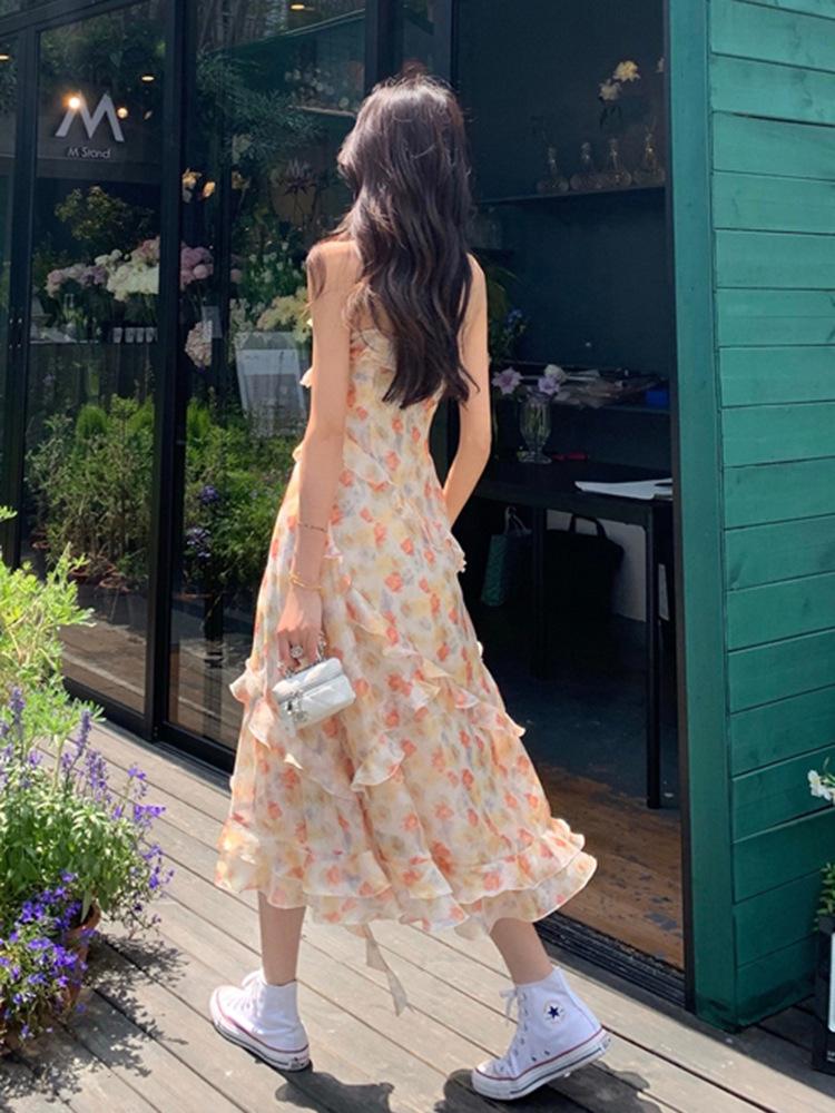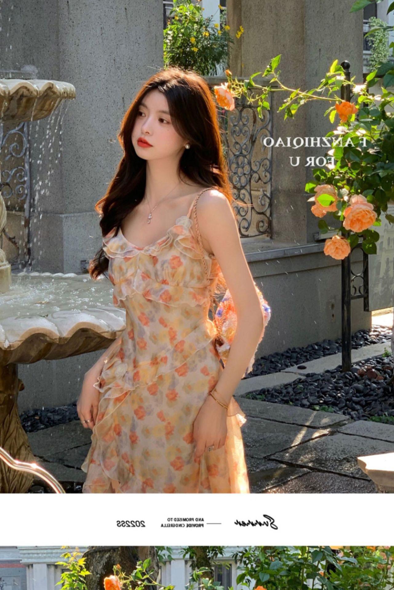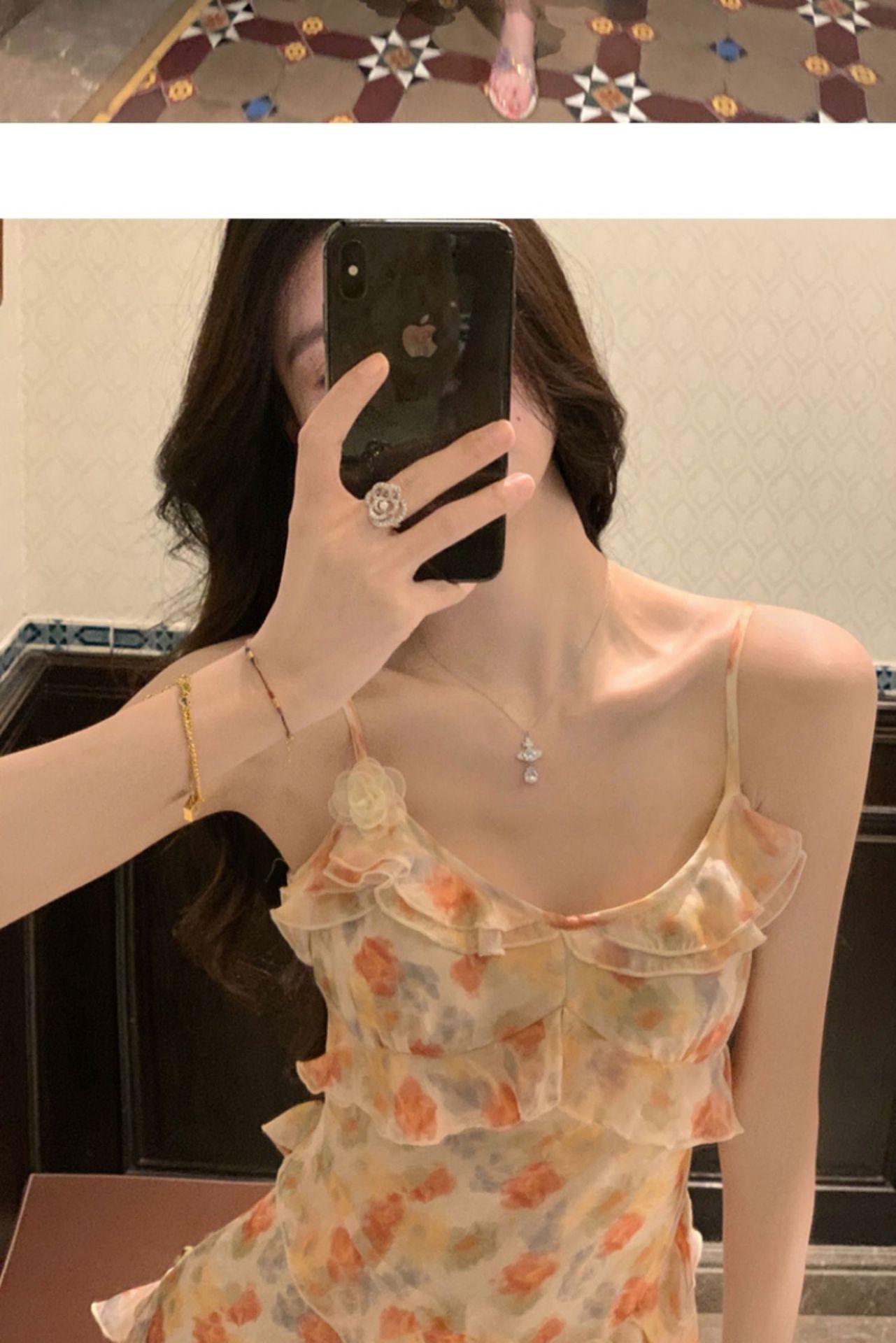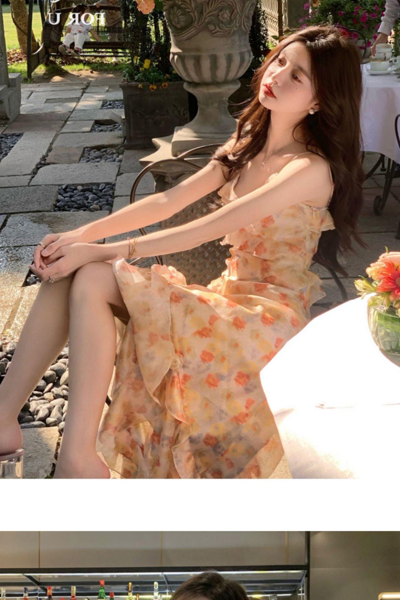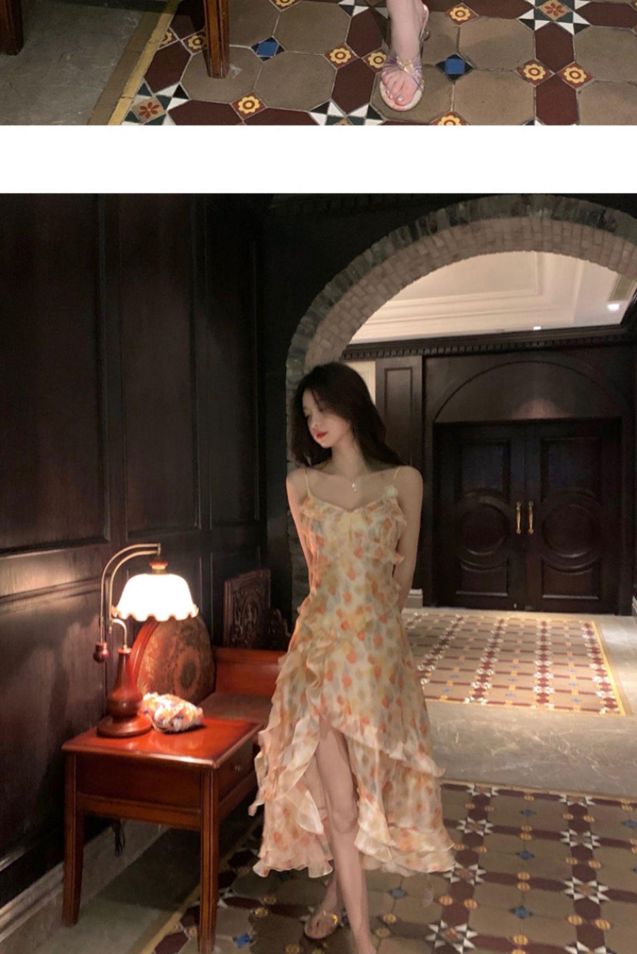 Compre Francês V-neck Split Floral Chiffon Sling vestido feminino 2024 verão nova chegada irregular sem mangas vestido vago no atacado no Joom.pro