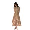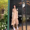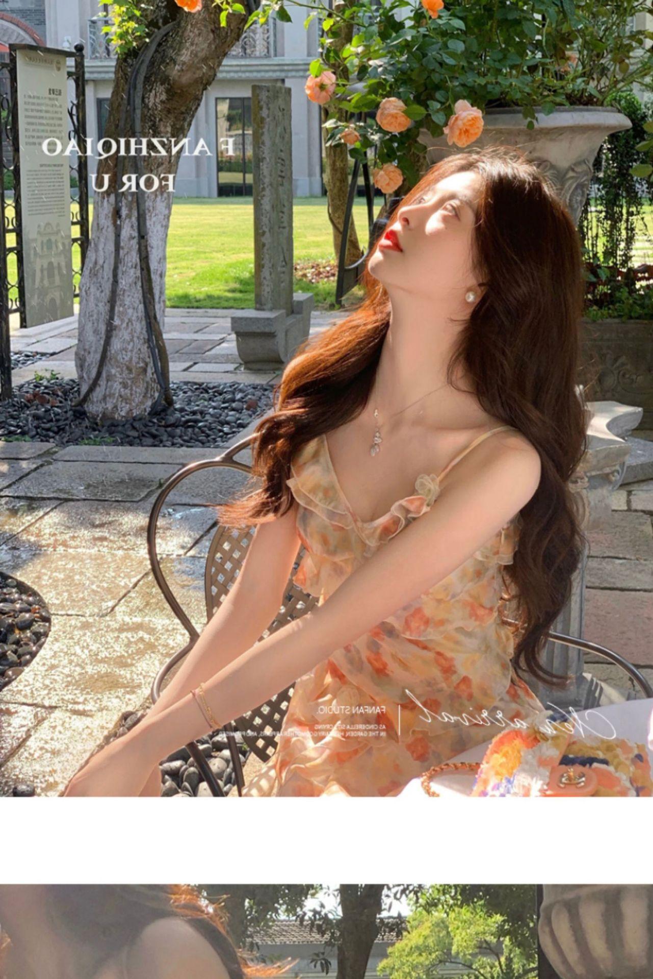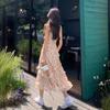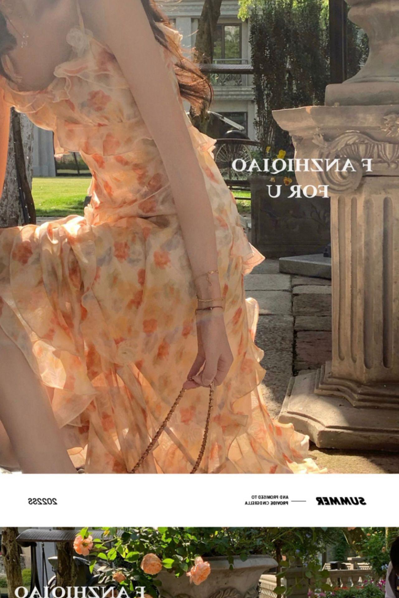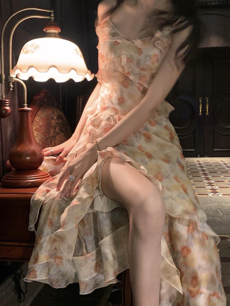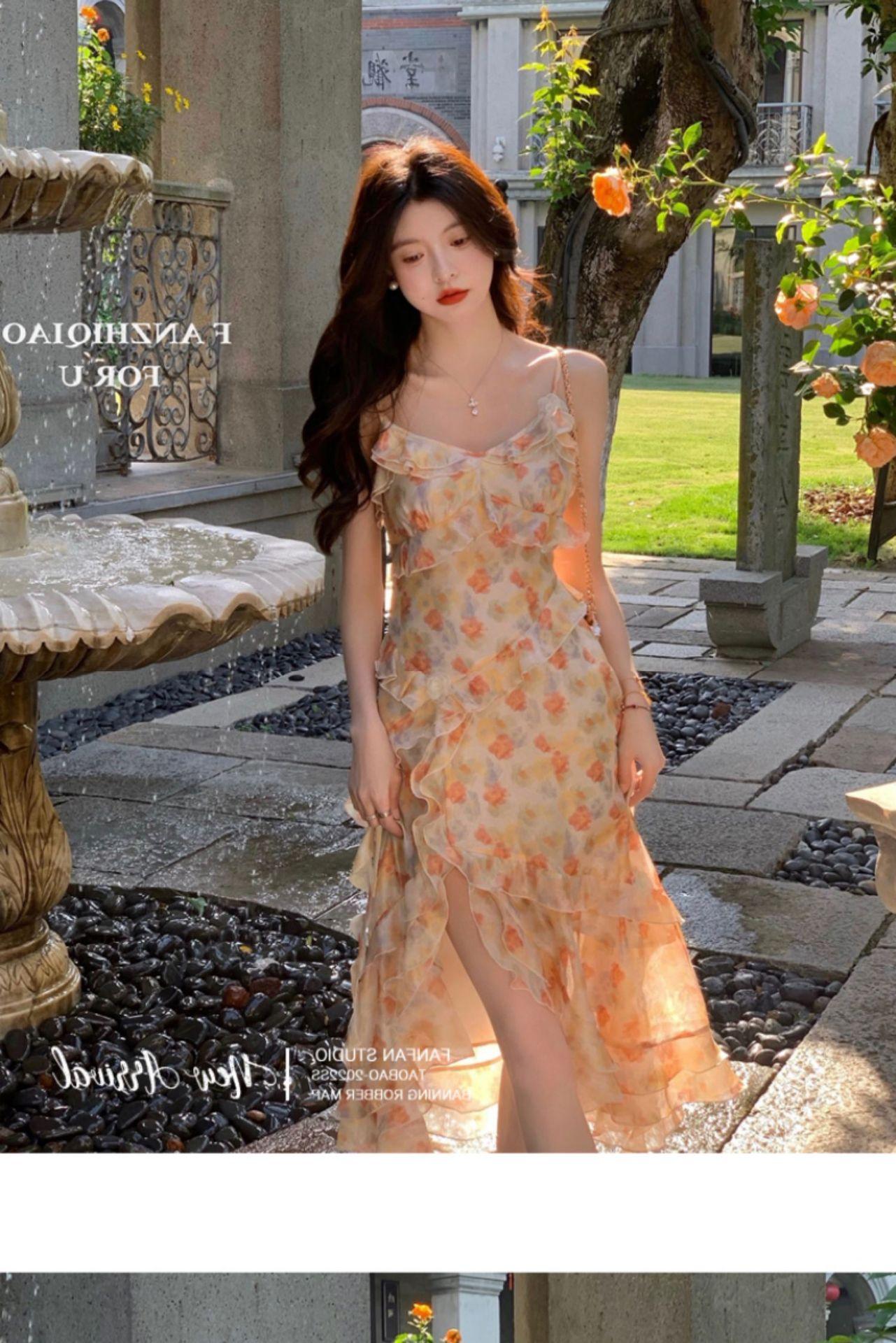 Francês V-neck Split Floral Chiffon Sling vestido feminino 2024 verão nova chegada irregular sem mangas vestido vago