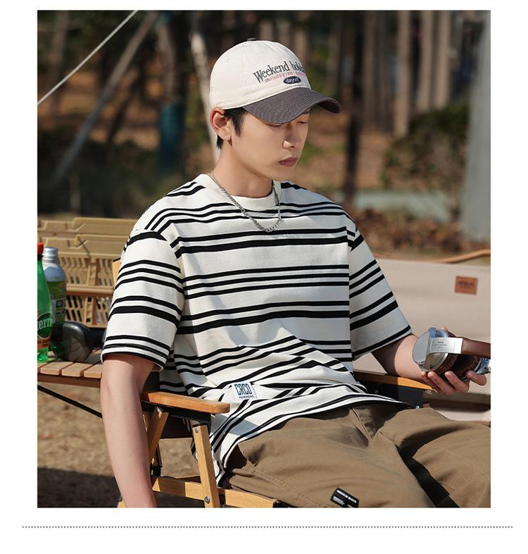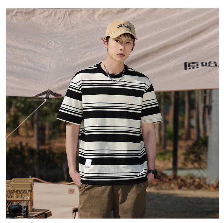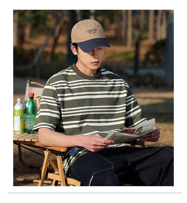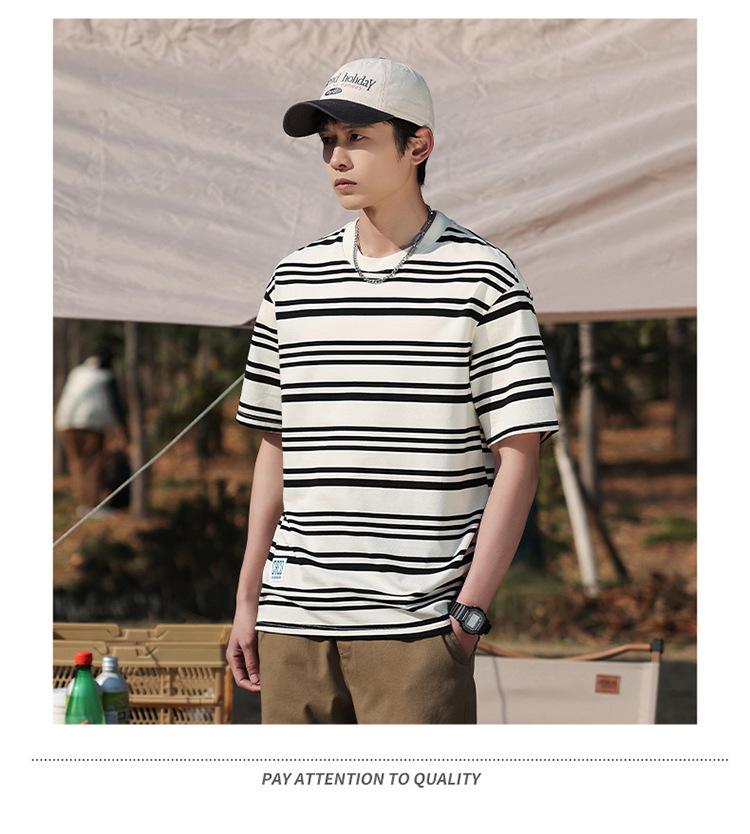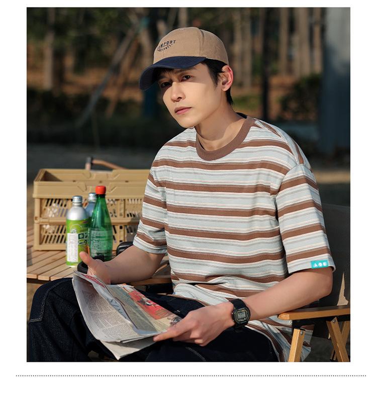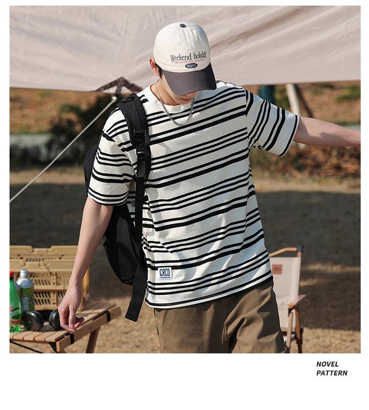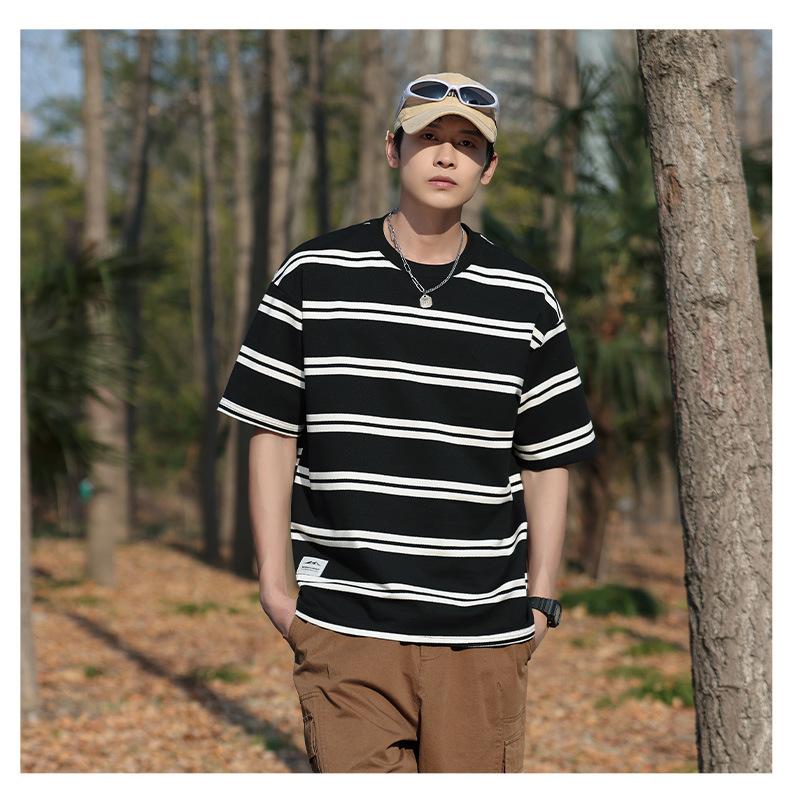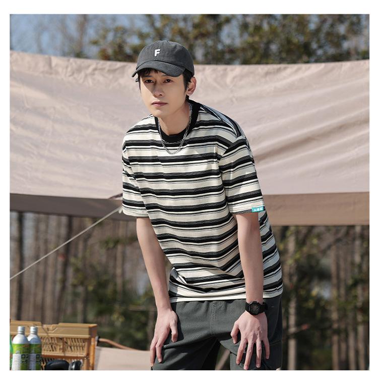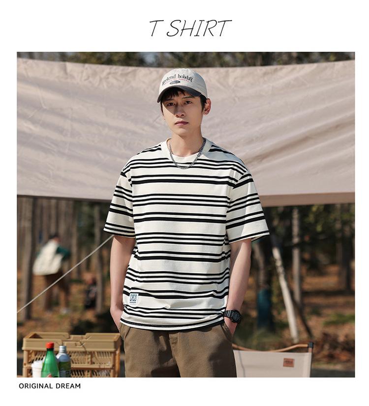 Camiseta de manga curta masculina verão nova marca de moda Ins casual meia manga camiseta estilo americano listrado solto top masculino
