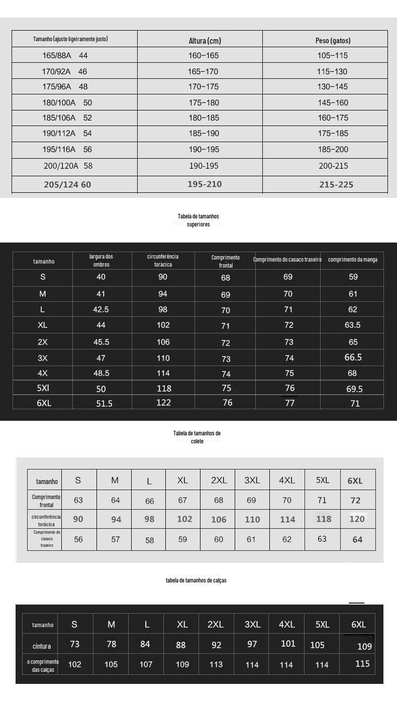165-S, 170-M, 175-L, 180-XL, 185-XXL, 190-3XL, 195-4XL