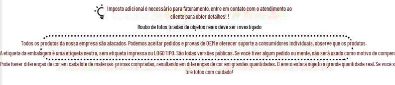 Todas as fotos da nossa loja são tiradas pelo próprio lojista e as cores são corrigidas com a maior precisão possível. Porém, como o lojista não é fotógrafo profissional e cada pessoa possui monitores diferentes, a diferença de cores é inevitável, o que também é uma dor de cabeça nas compras online. Portanto, os clientes que não podem aceitar qualquer diferença de cor devem considerar cuidadosamente antes de comprar. Problemas de diferença de cor não serão usados como base para avaliações negativas, reclamações, devoluções ou trocas.