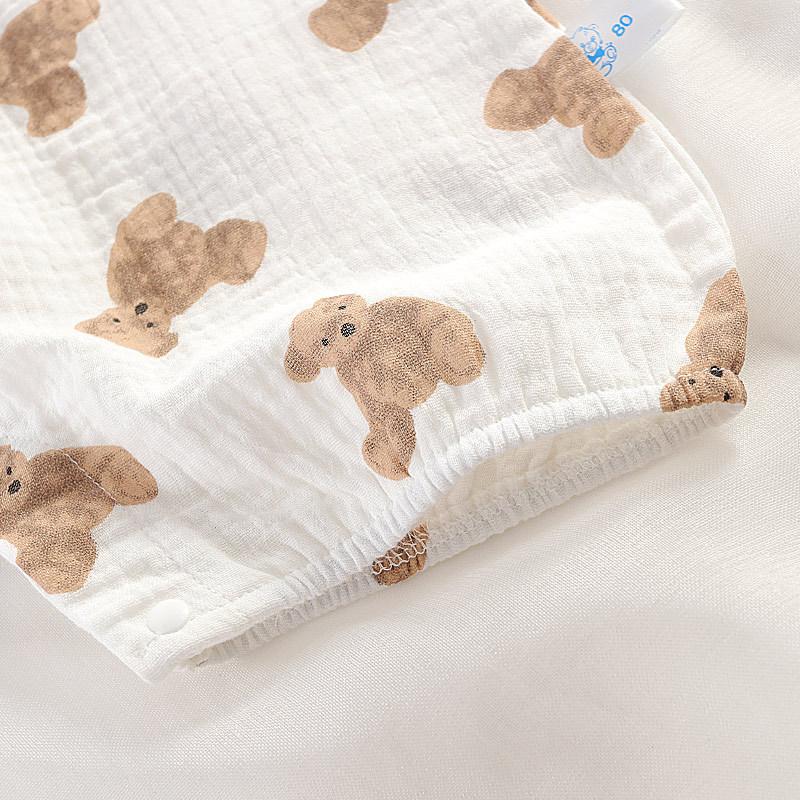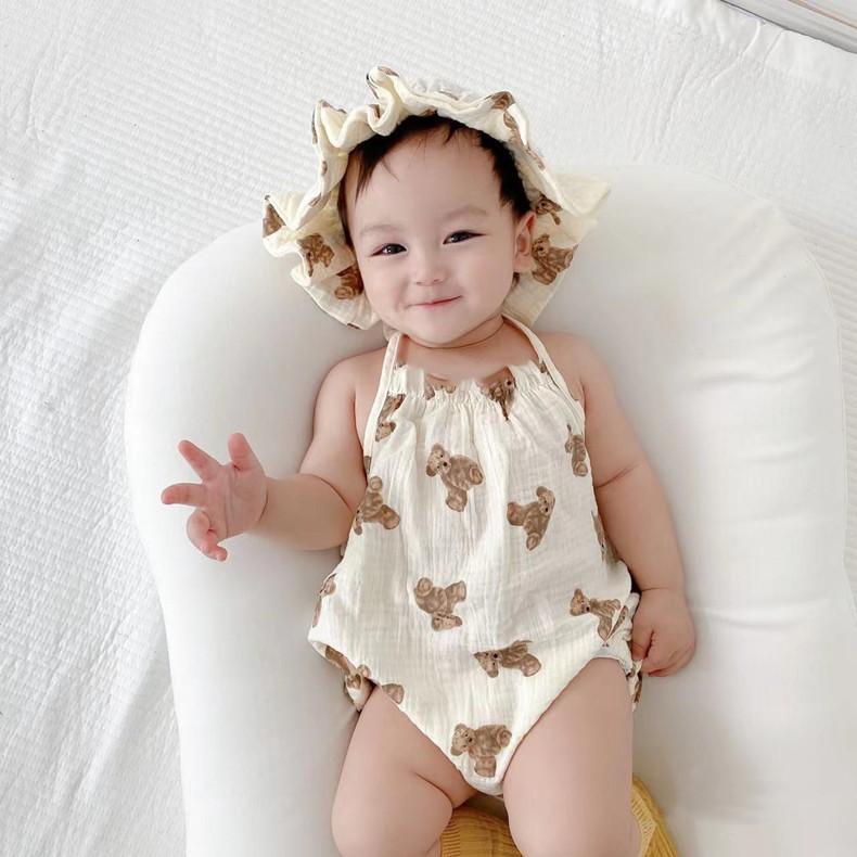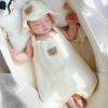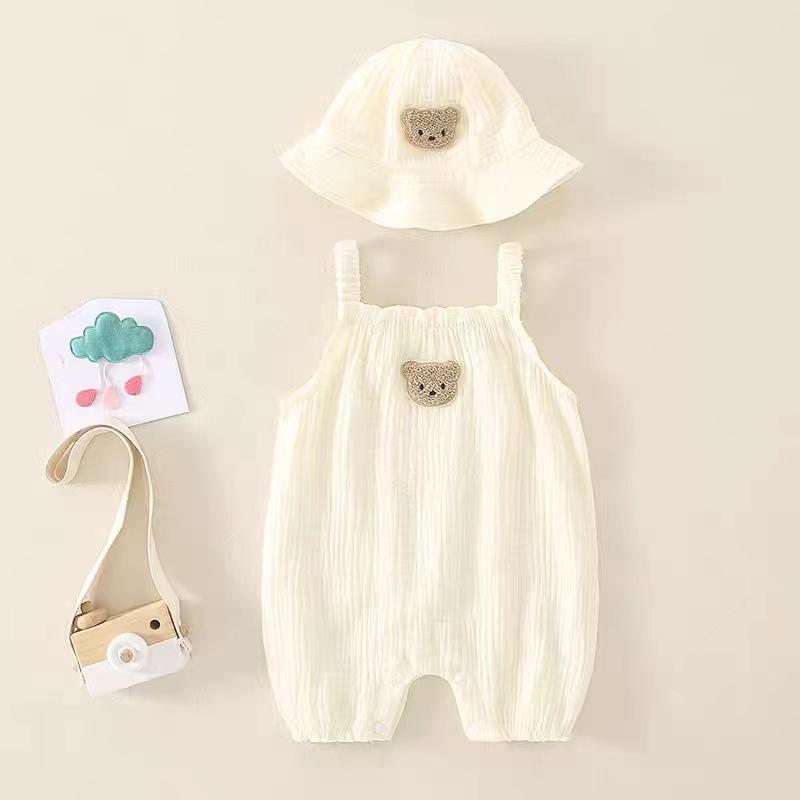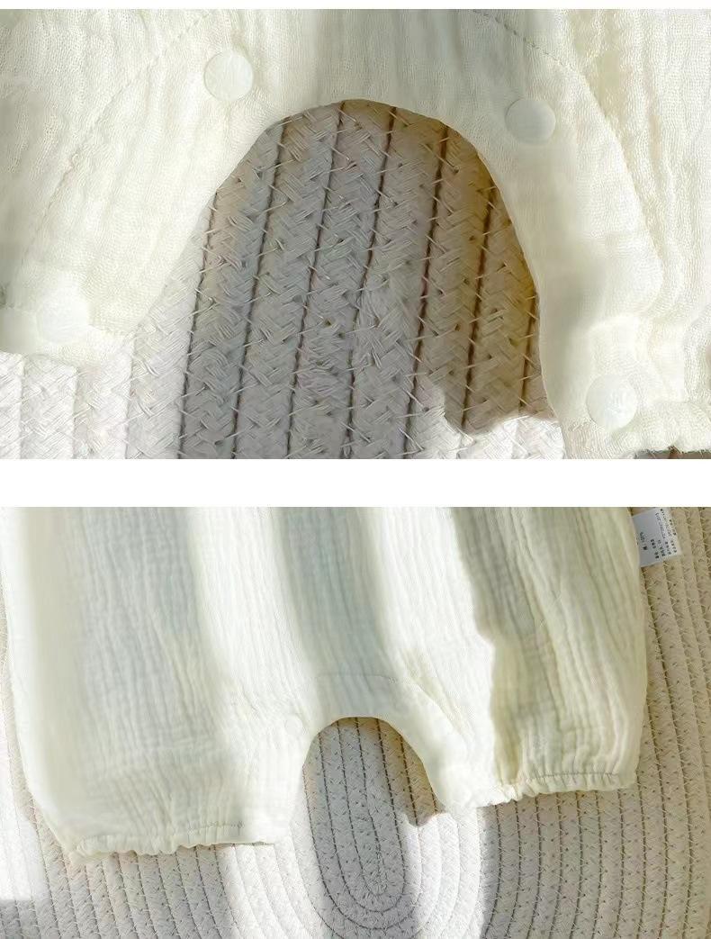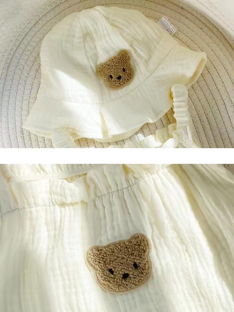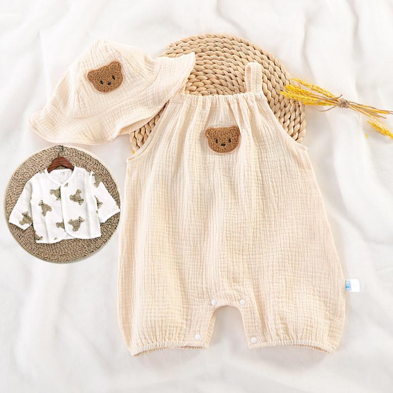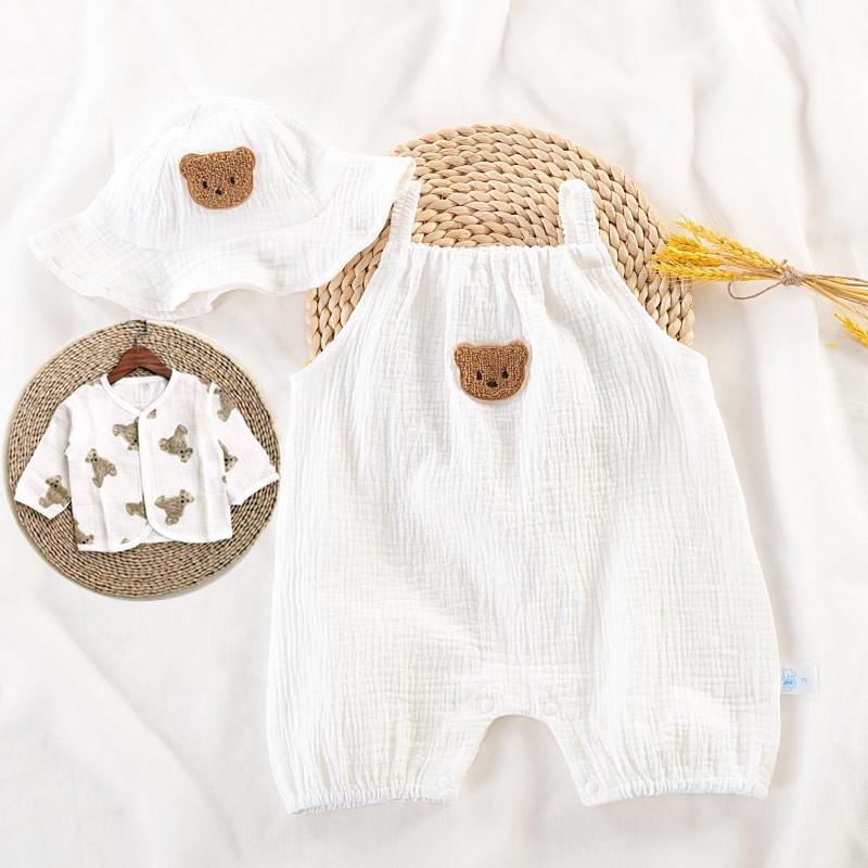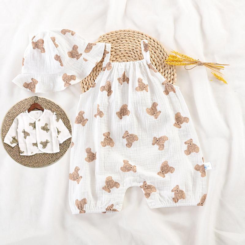 White gauze one-piece + hat + white cardigan, Beige gauze one-piece + hat + white cardigan, Full printed gauze...
