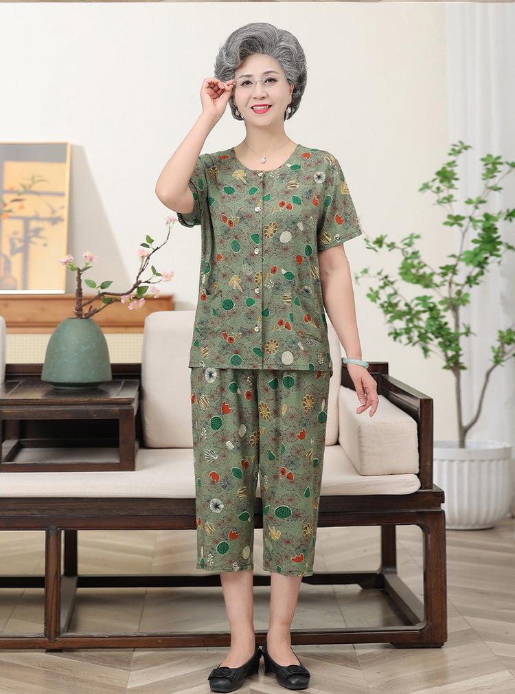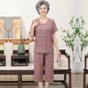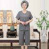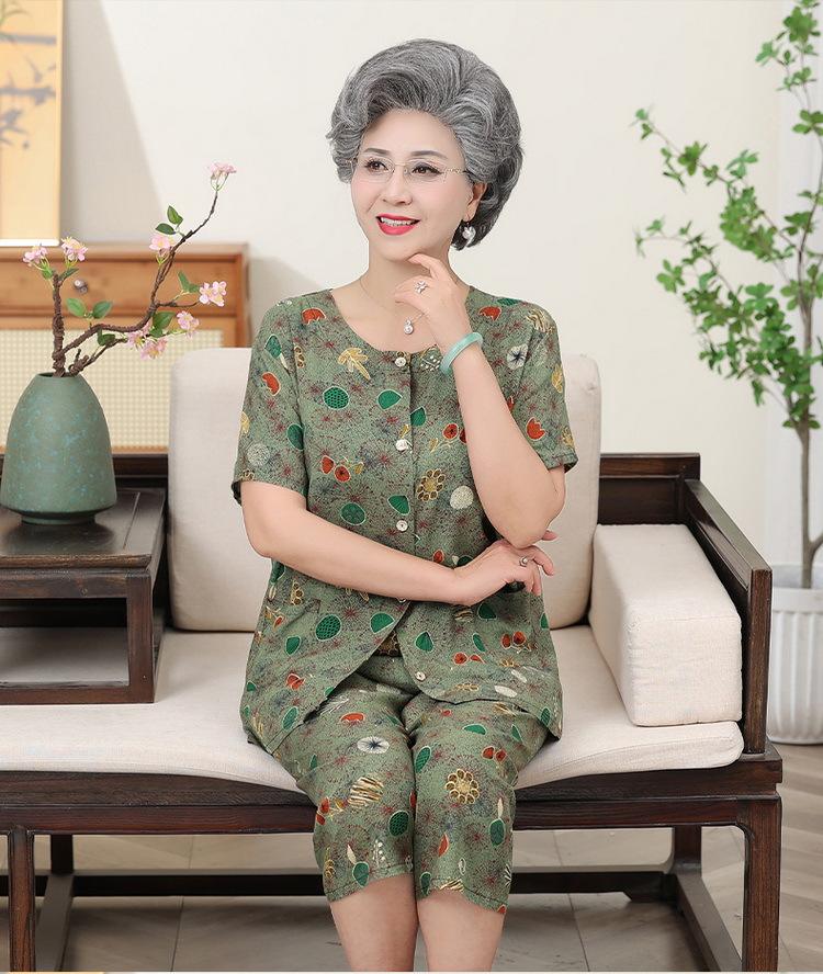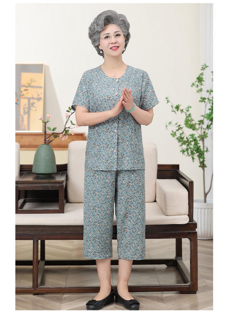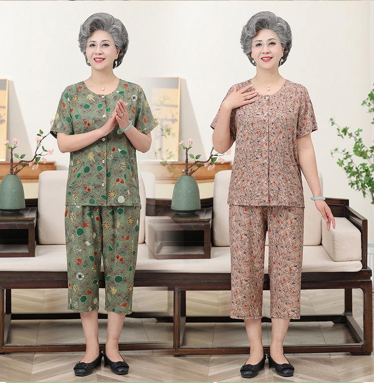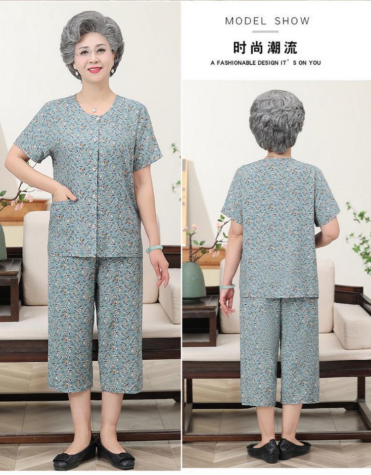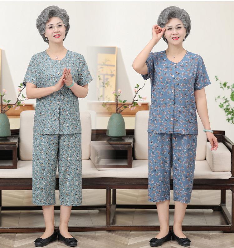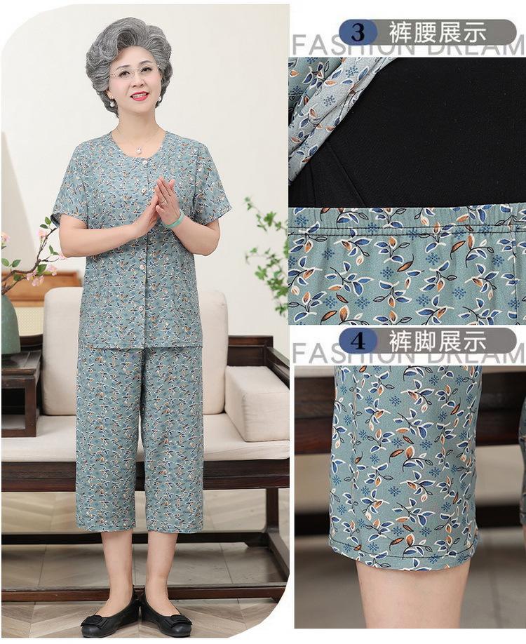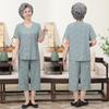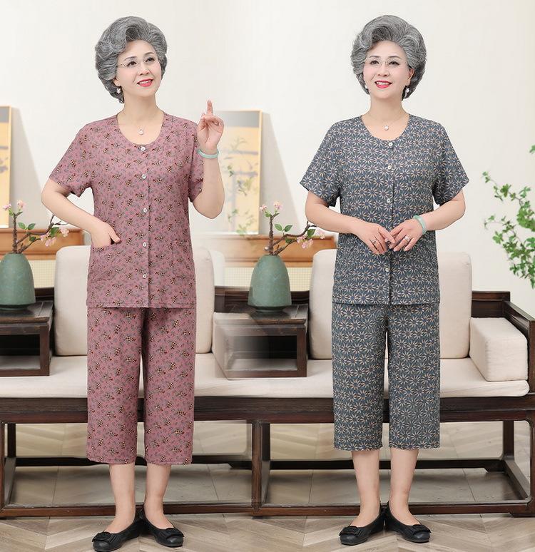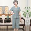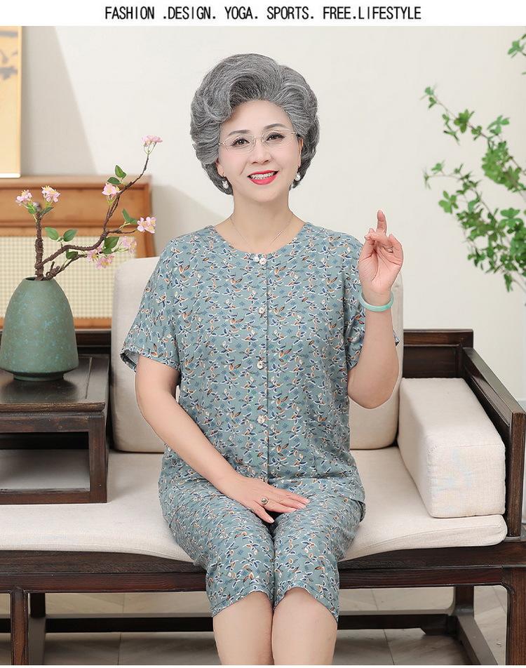 Verão Meia-idade e Idosos Mãe Algodão Seda Cardigan Pijama de manga curta terno Algodão artificial Vovó Casa Roupas Conjunto de duas peças
