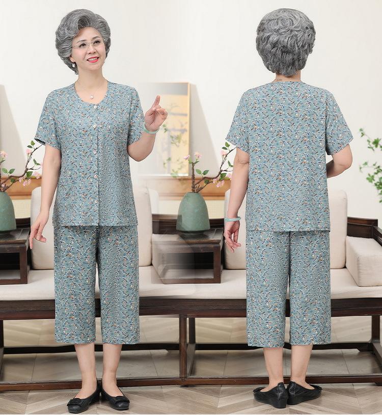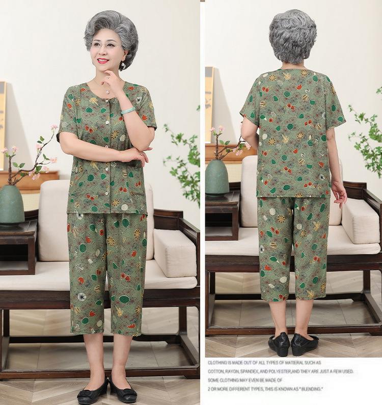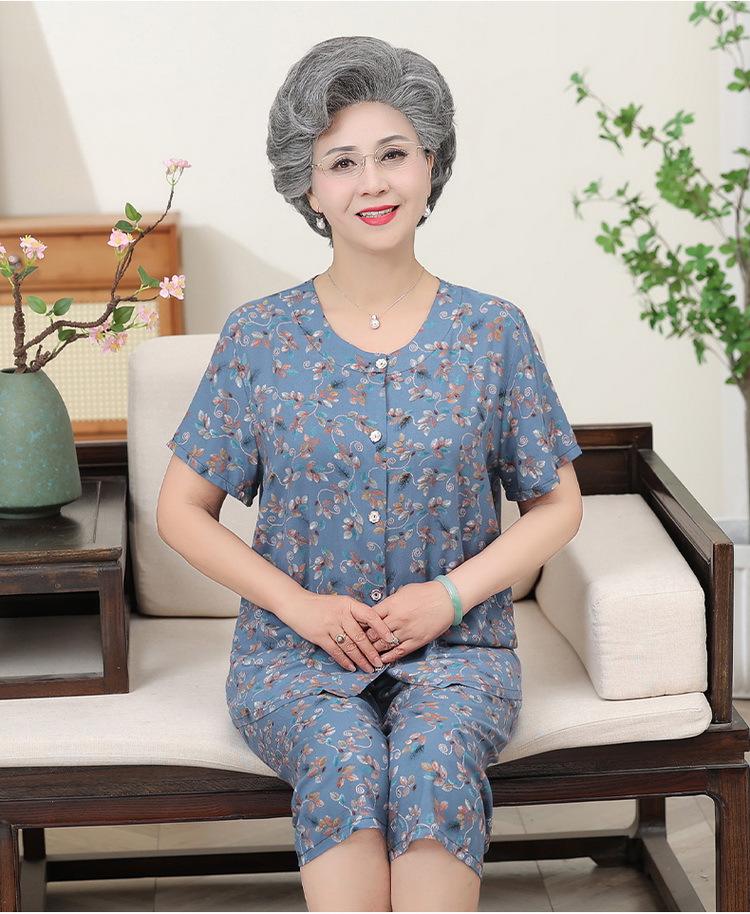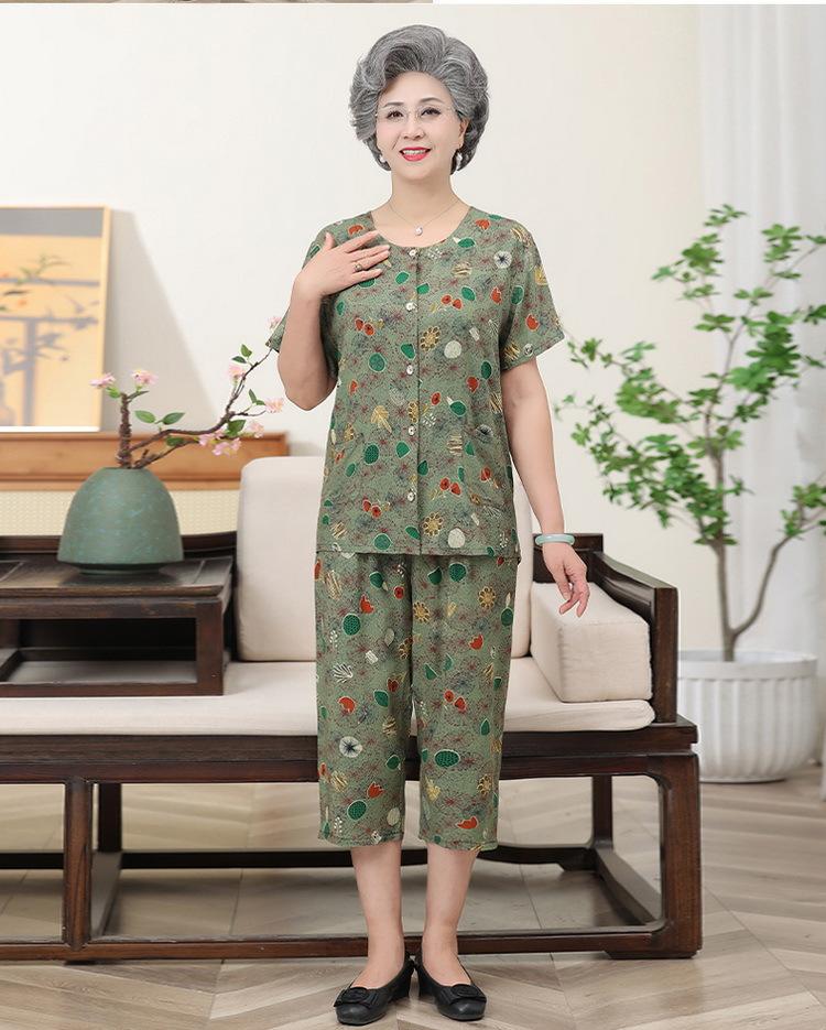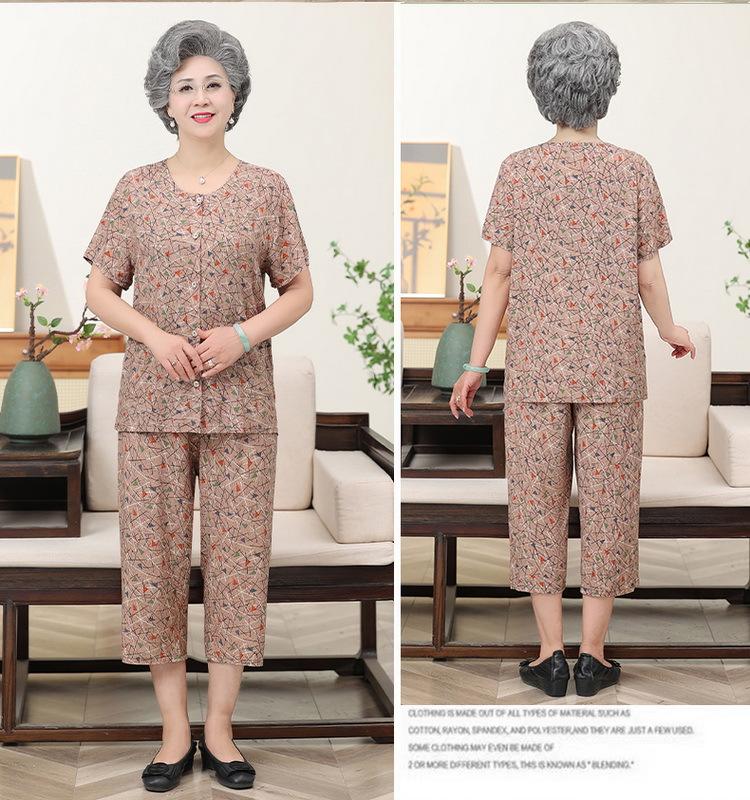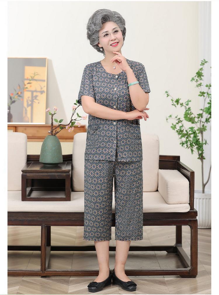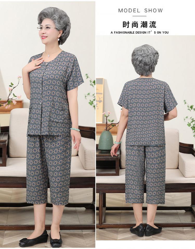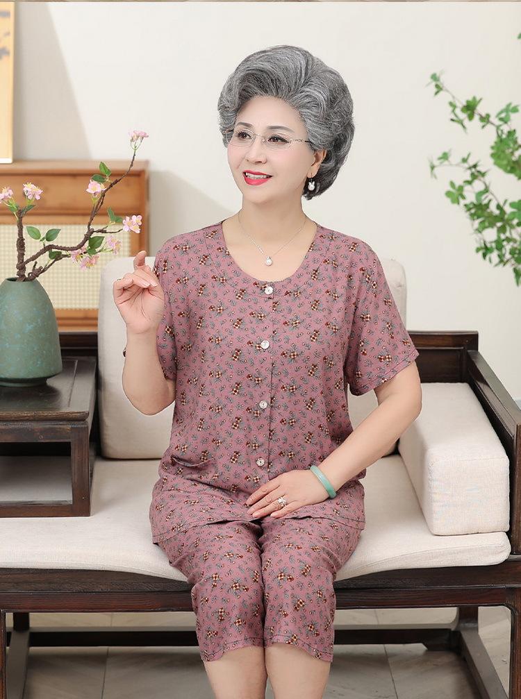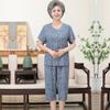 Verão Meia-idade e Idosos Mãe Algodão Seda Cardigan Pijama de manga curta terno Algodão artificial Vovó Casa Roupas Conjunto de duas peças