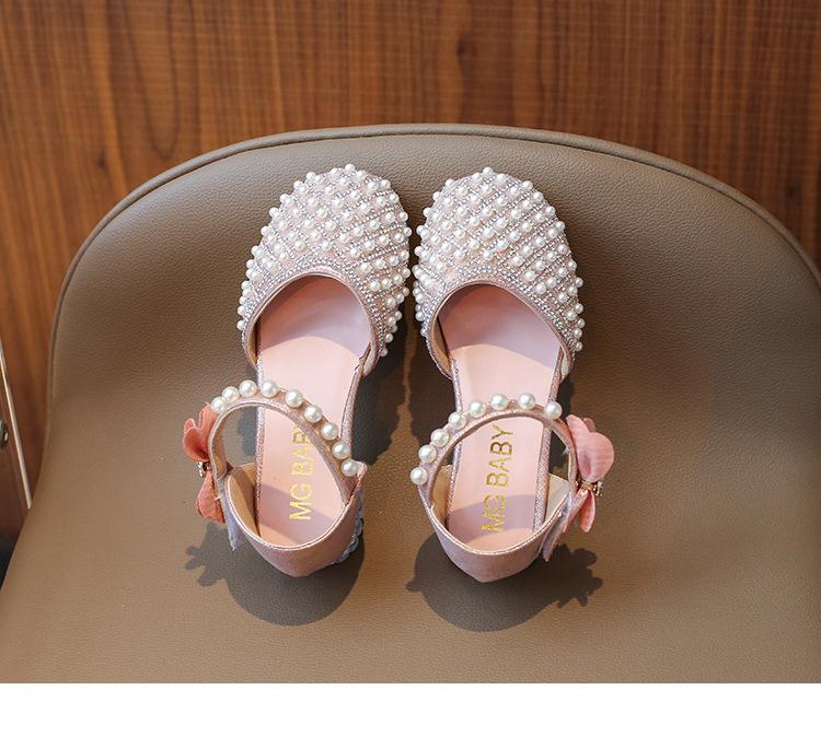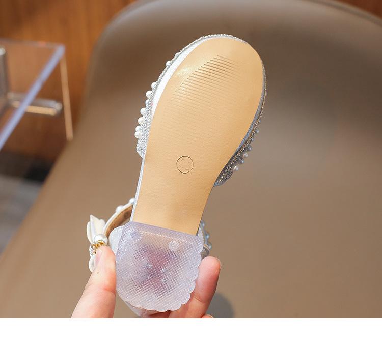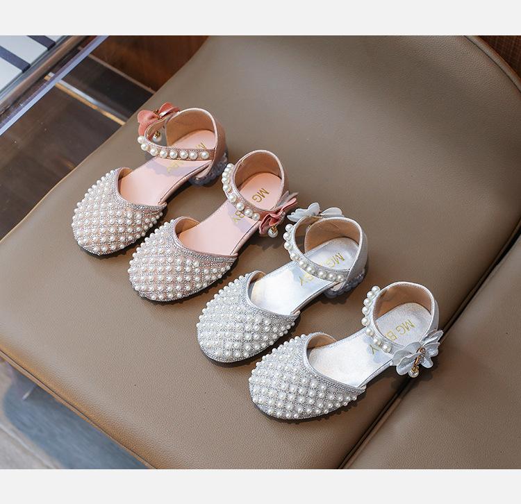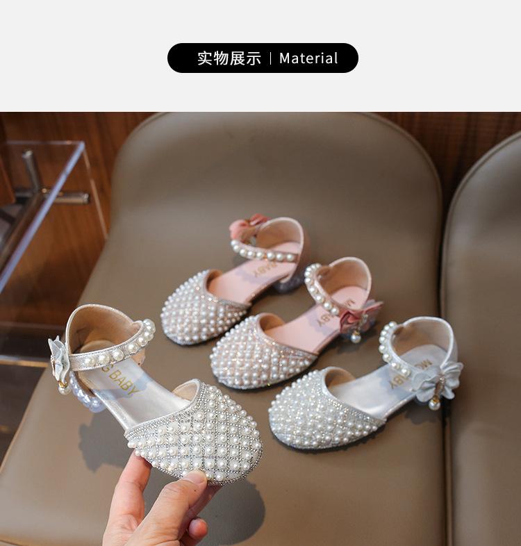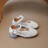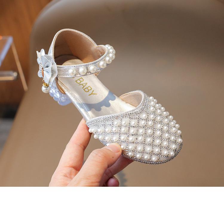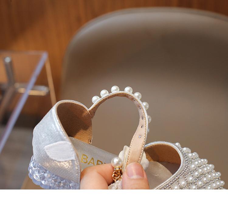 Sandálias Infantis 2025 Primavera e Verão Pérola Strass Meninas Sapatos de Princesa Coreanos Sapatos de Performance Sola Macia Antiderrapante Sapatos de Menina
