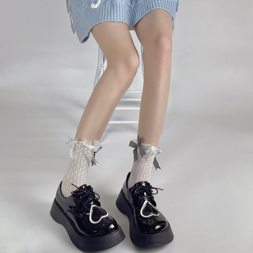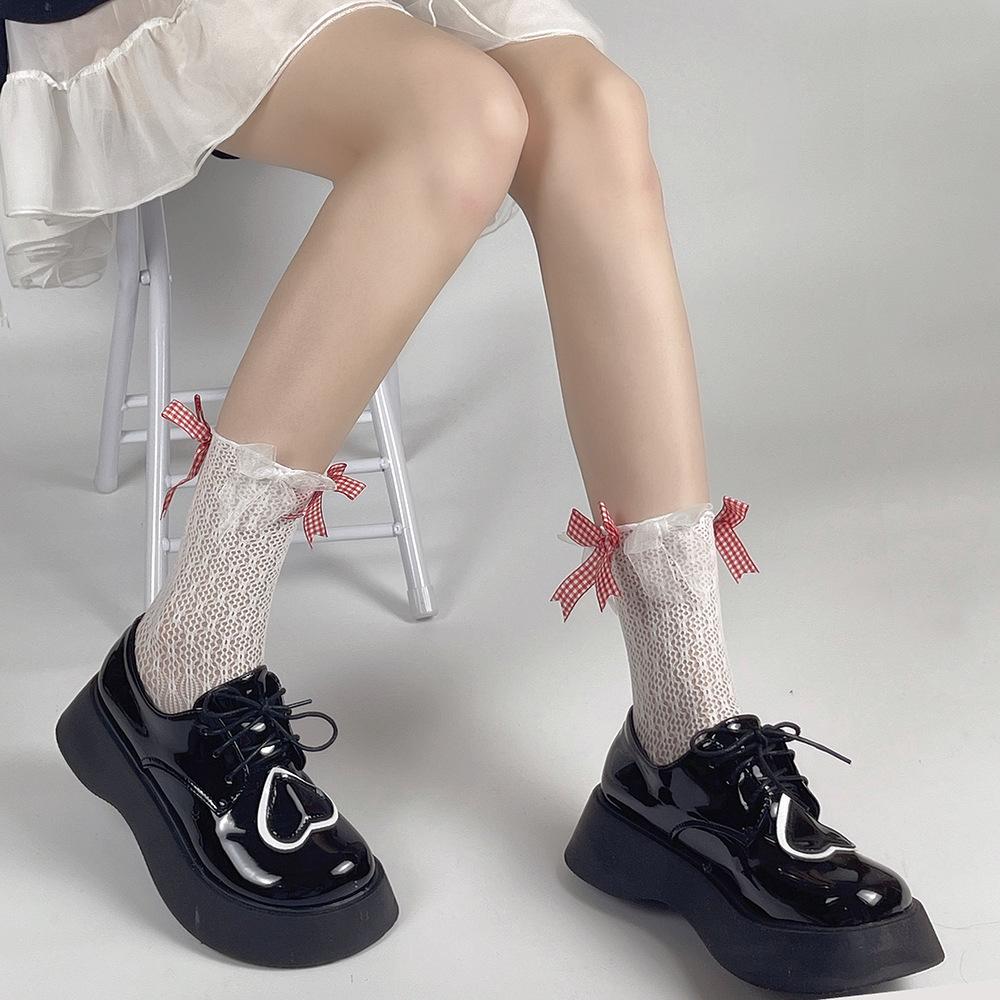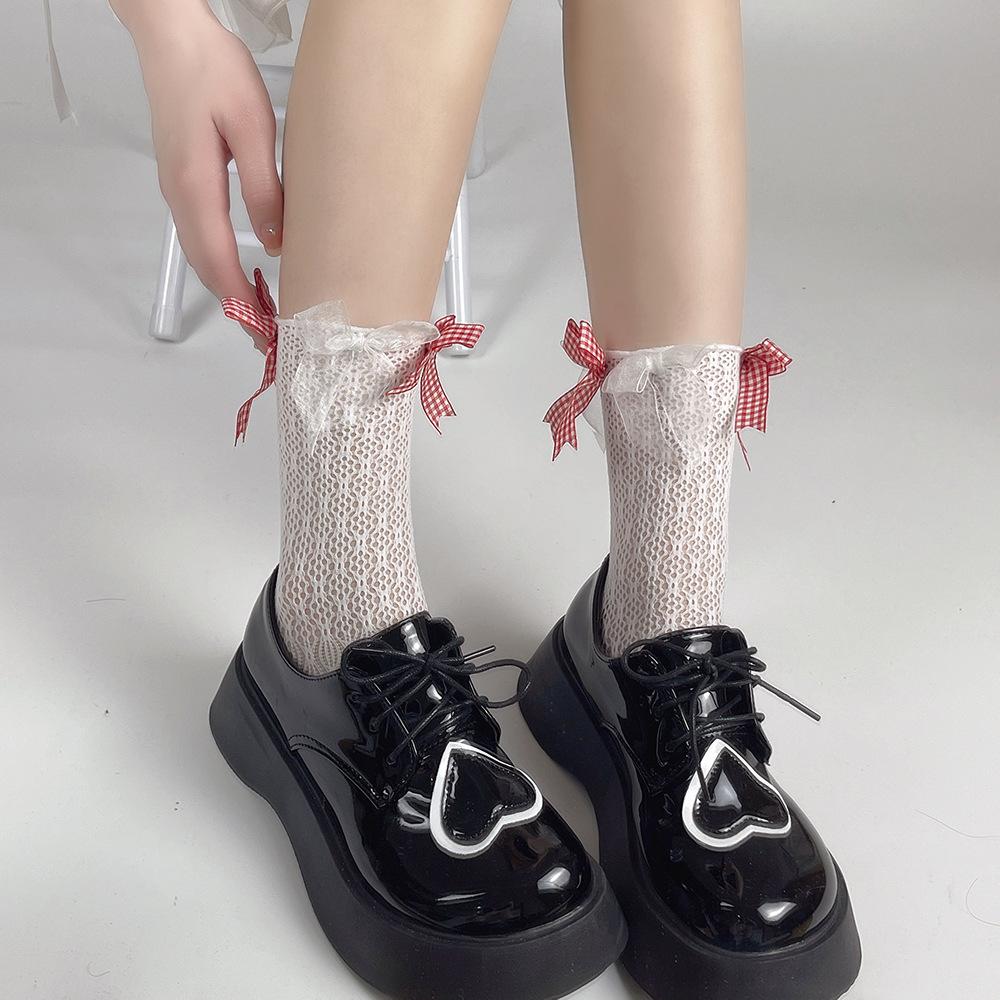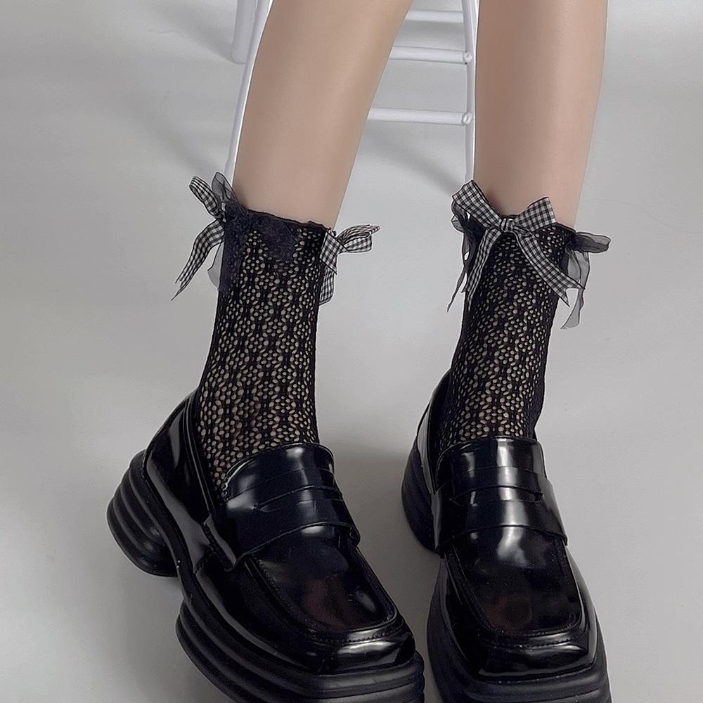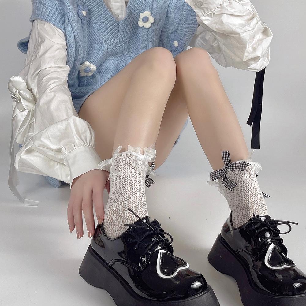 Estilo japonês e coreano novo laço xadrez malha renda oca net meias curtas meias brancas empilhadas menina bonito
