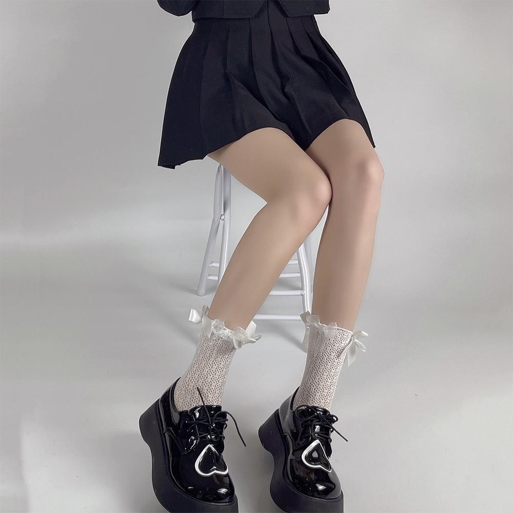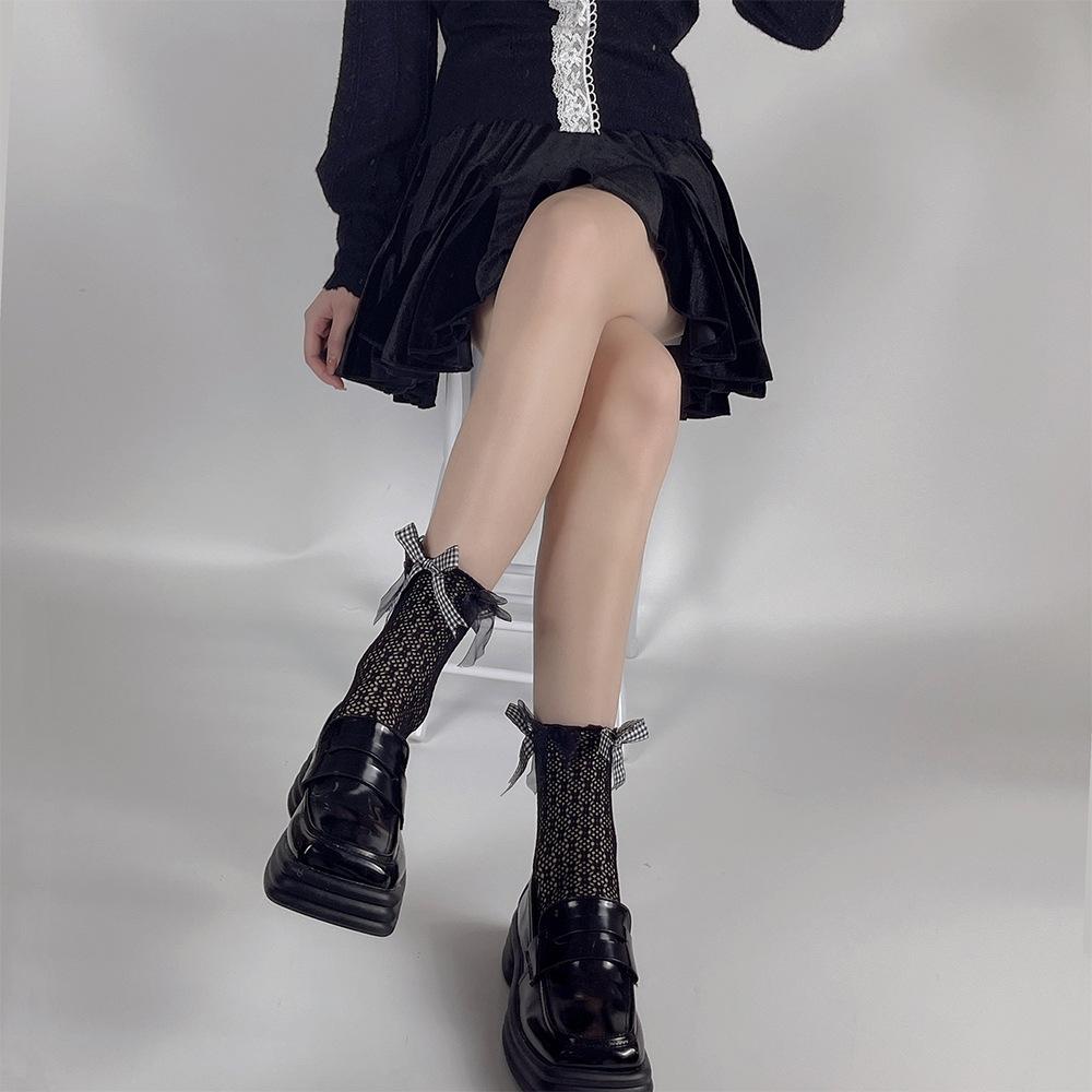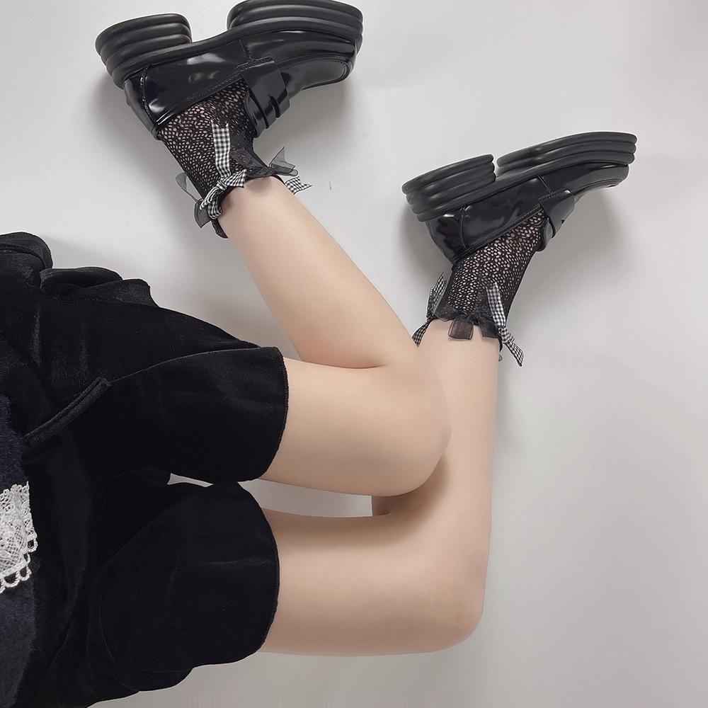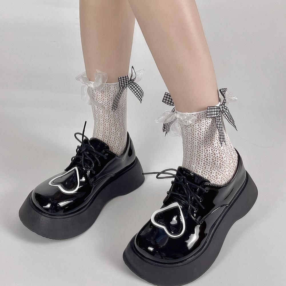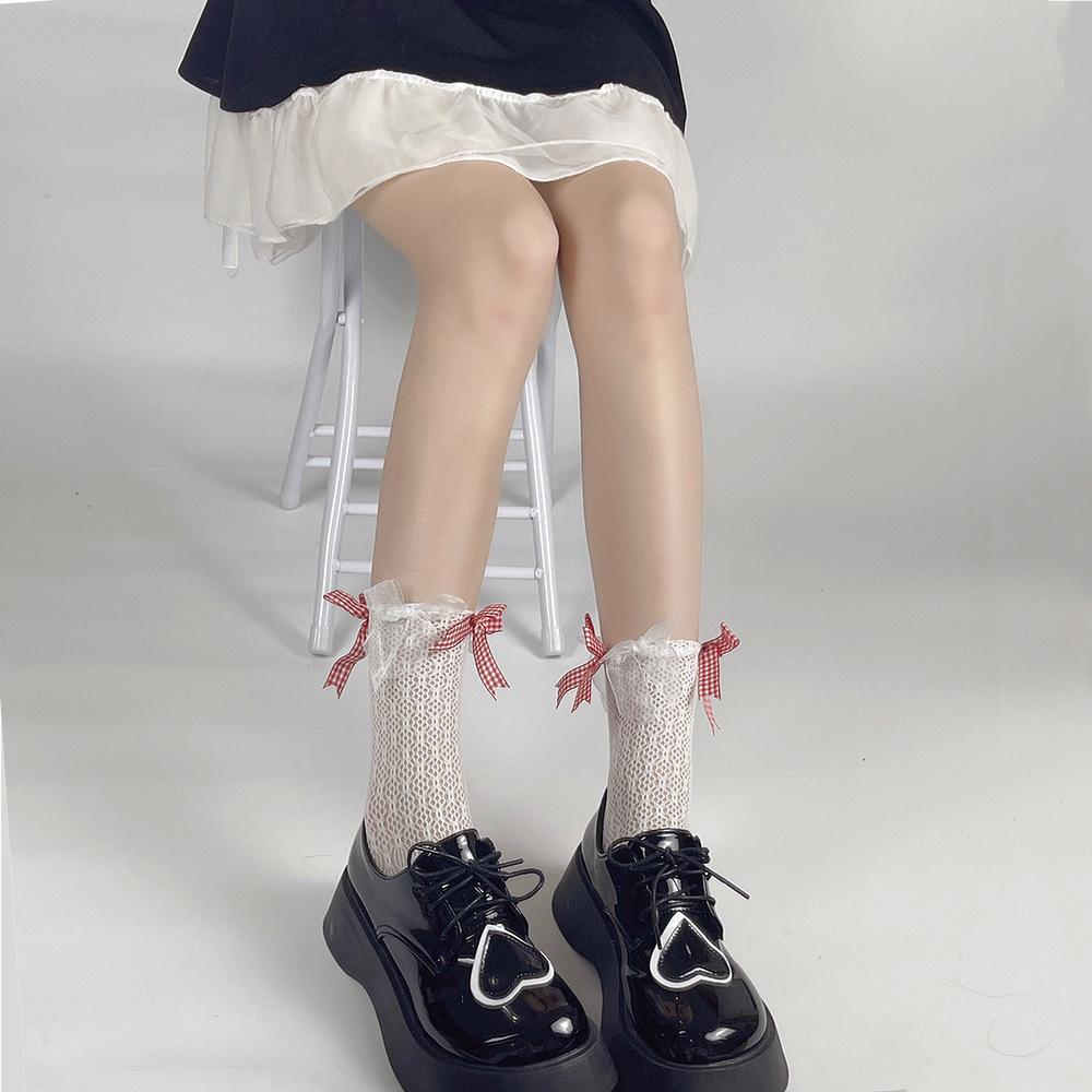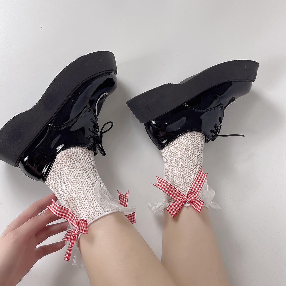 Estilo japonês e coreano novo laço xadrez malha renda oca net meias curtas meias brancas empilhadas menina bonito
