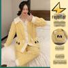 Pijama de Veludo Coral para Mulheres Inverno Forrado com Lã Espessado Quente Roupa de Casa Estampada Pêssego Urso Crescente Conjunto