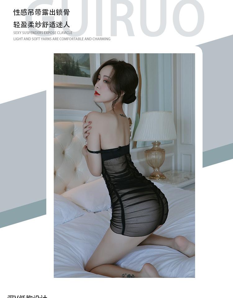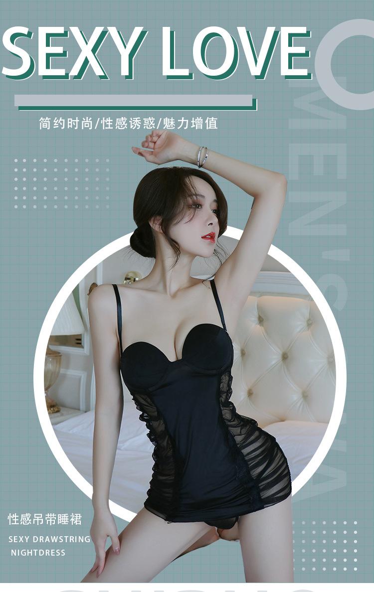 Longa noite sexy lingerie sexy profundo V malha plissada transparente tentação alça quente roupa de noite terno 1059