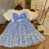 Vestido Novo de Verão 2024 Estilo Coreano para Meninas, Vestido de Princesa Infantil Médio e Grande da Moda, Desenho Animado Fofo com Manga Bufante