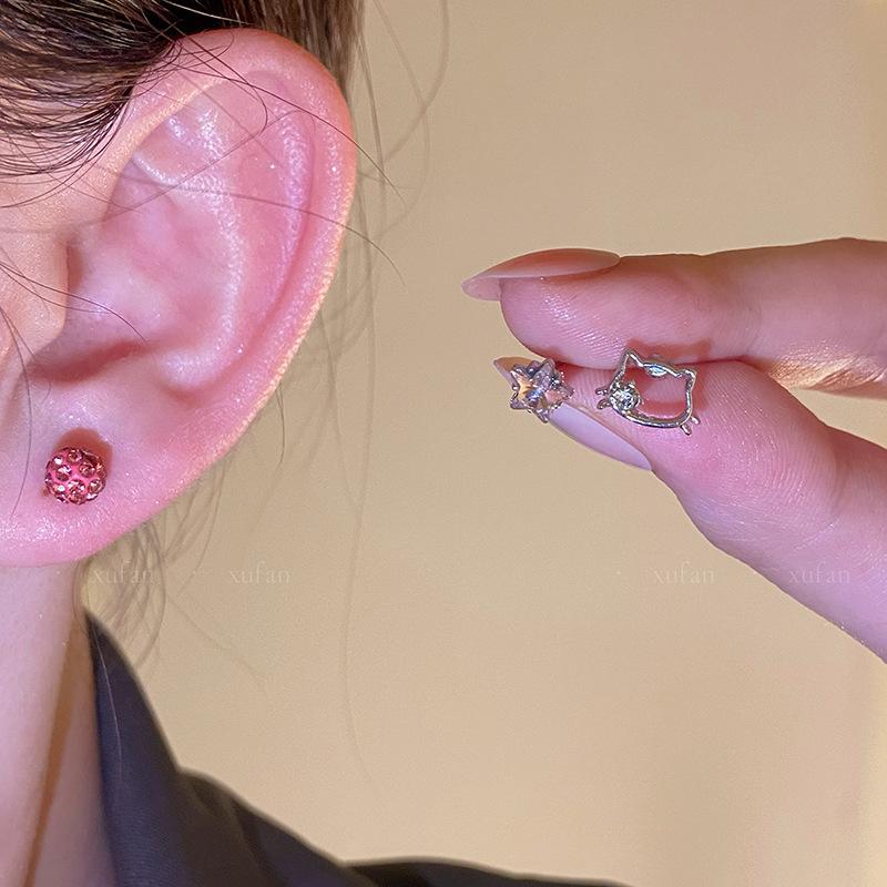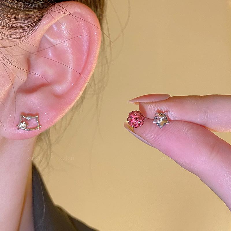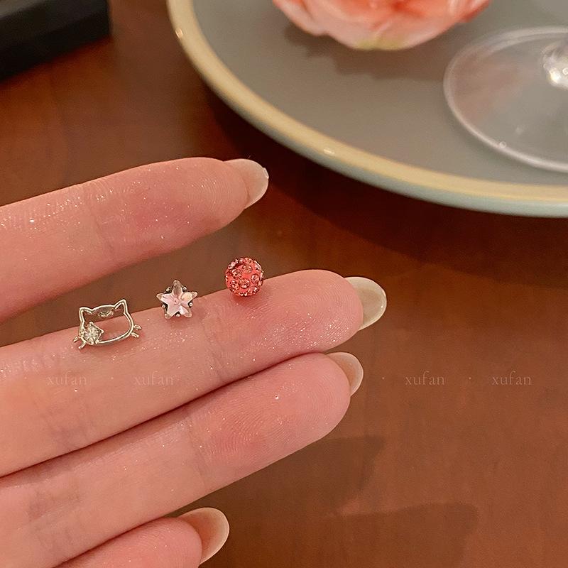 Brincos de gato Conjunto de três peças Brincos de zircônia em estrela de cinco pontas Requintado Pequeno Estilo Sense ins Elegante Brincos de agulha de prata