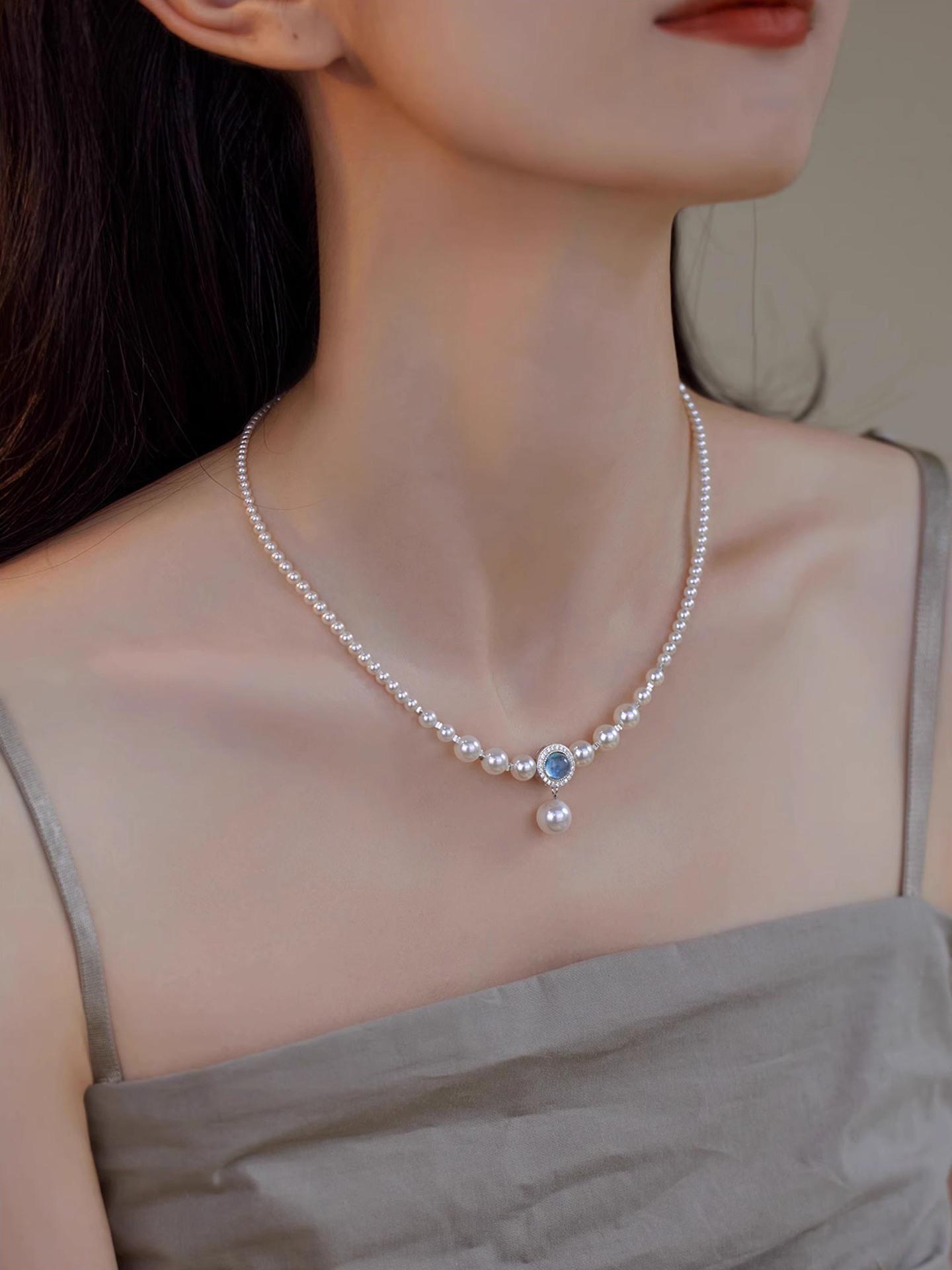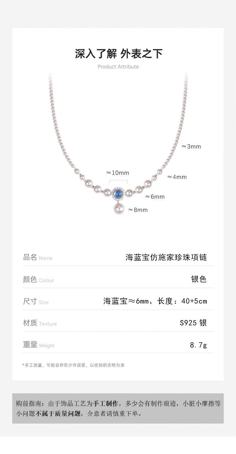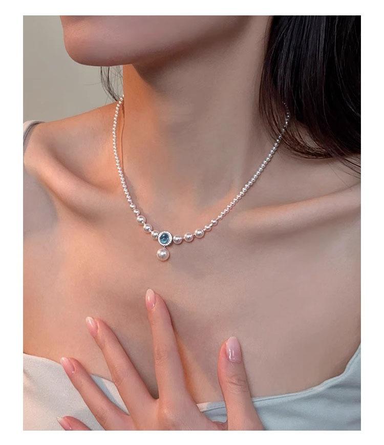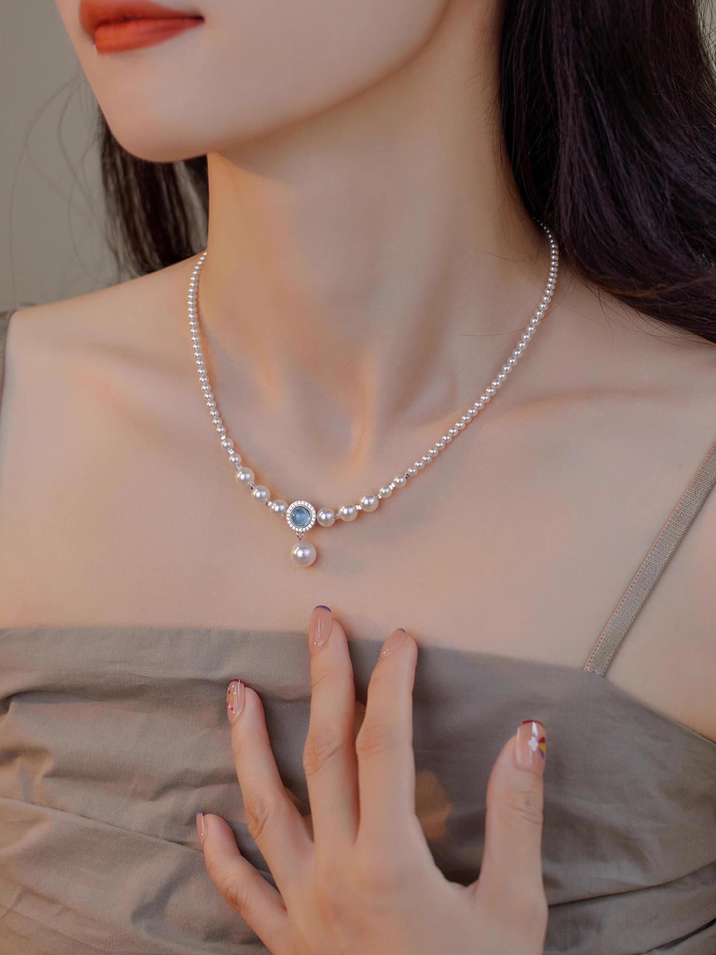 S925 prata esterlina natural aquamarine colar feminino forte luz redonda imitação Shijia Pearl ins nicho luz luxo estilo colar
