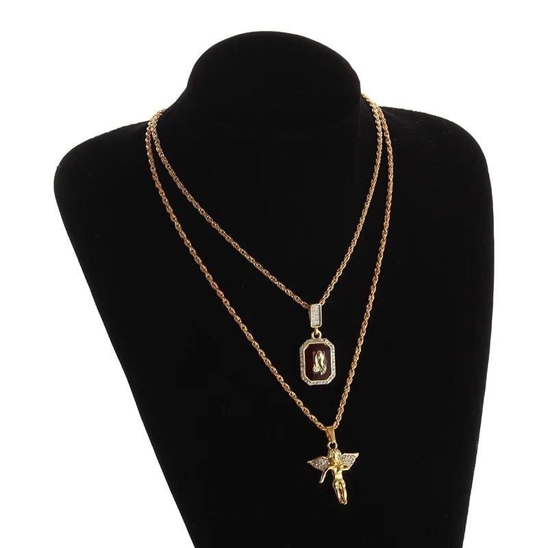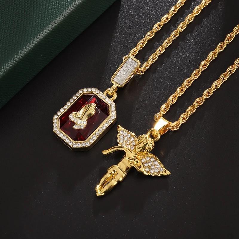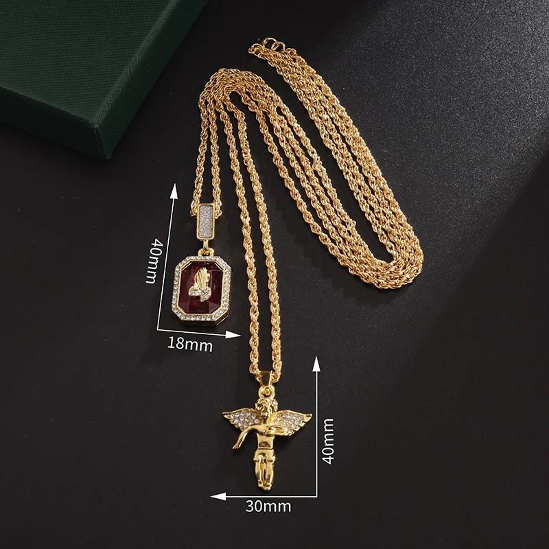 Pingente de Anjo Estilo Novo Europeu e Americano Amuleto da Moda Conjunto Ouro Rubi Colar Corda Hip-Hop Tendência de Personalidade