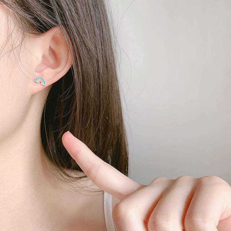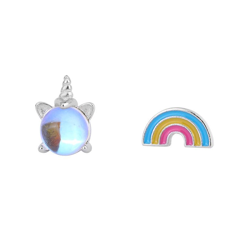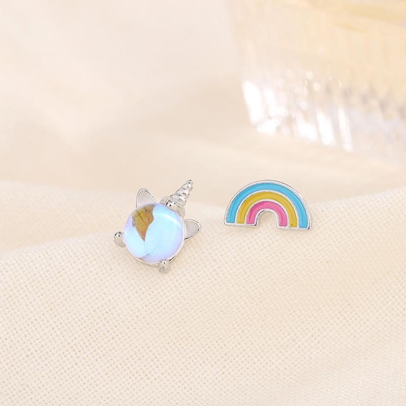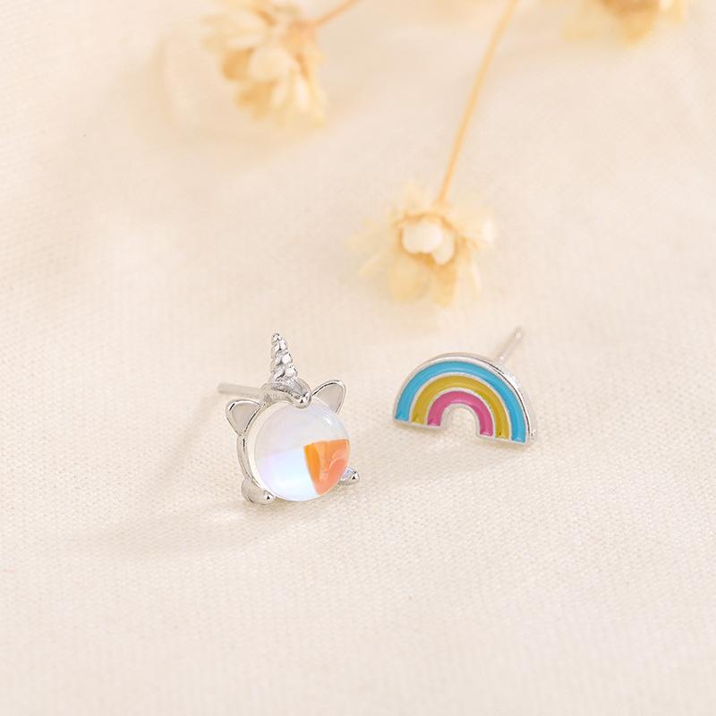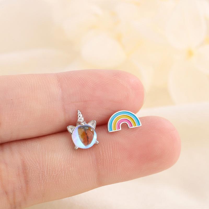 Brincos S925 Brincos de unicórnio arco-íris Design de nicho assimétrico Pedra da lua Joias de orelha de verão para mulheres