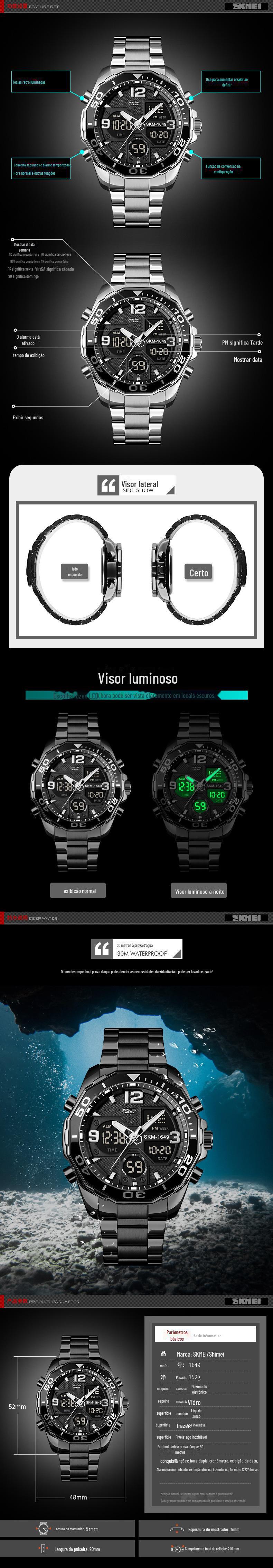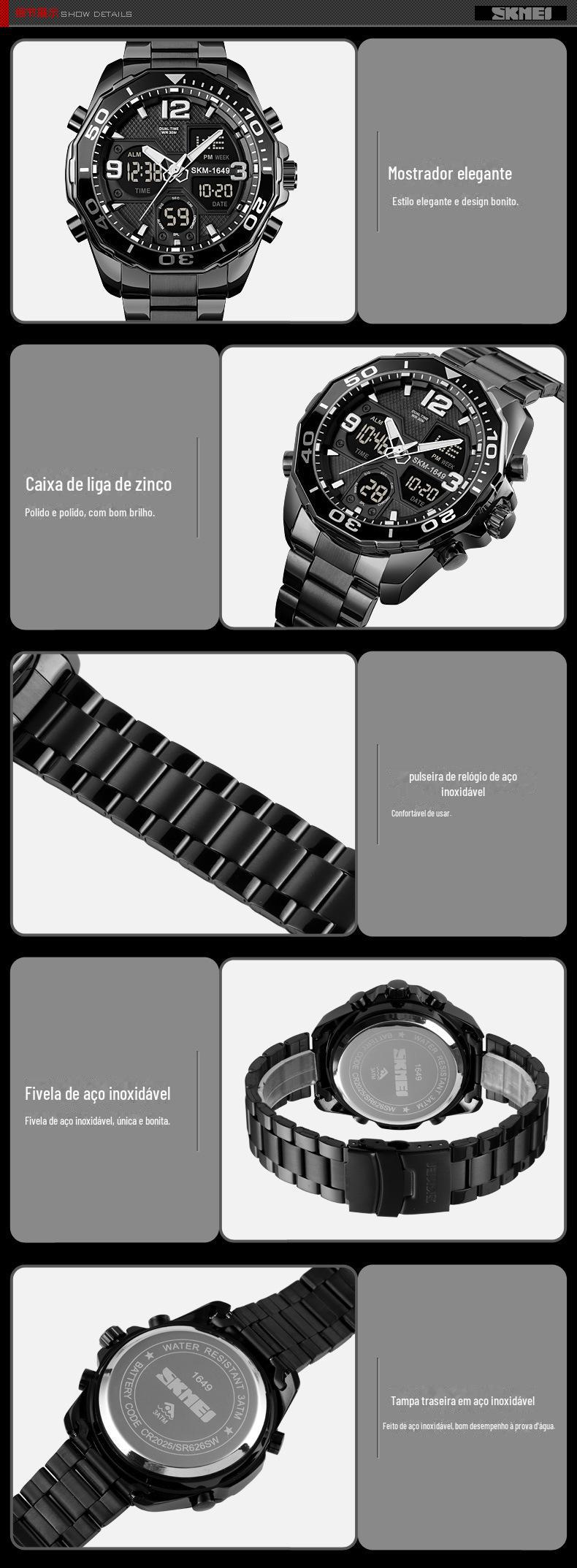 | Material | Caixa em liga de zinco, pulseira em aço inoxidável, espelho de vidro, tampa inferior em aço inoxidável, fivela em aço inoxidável |