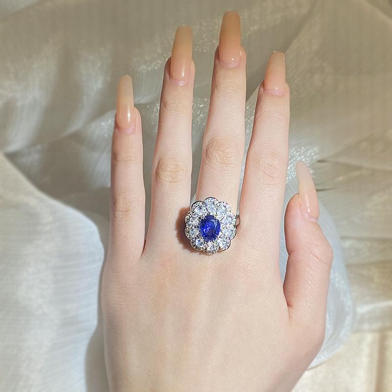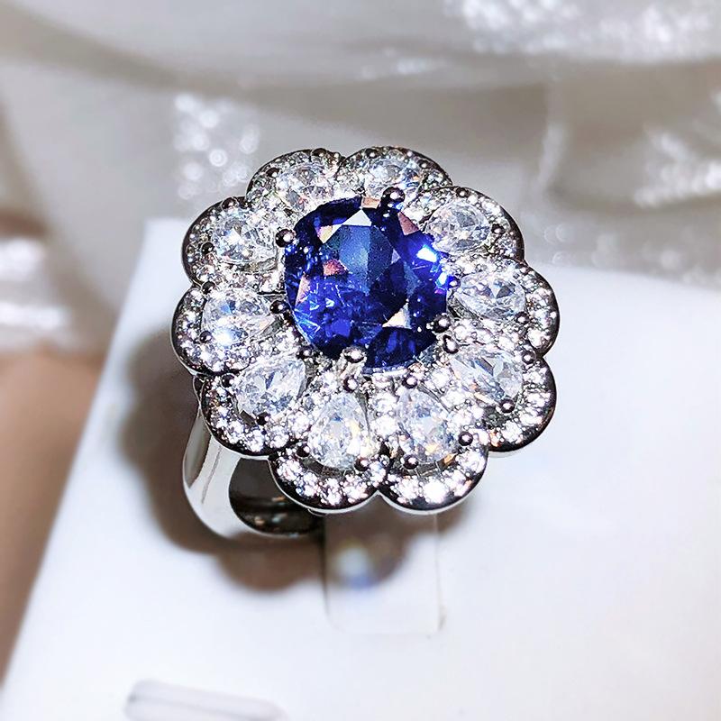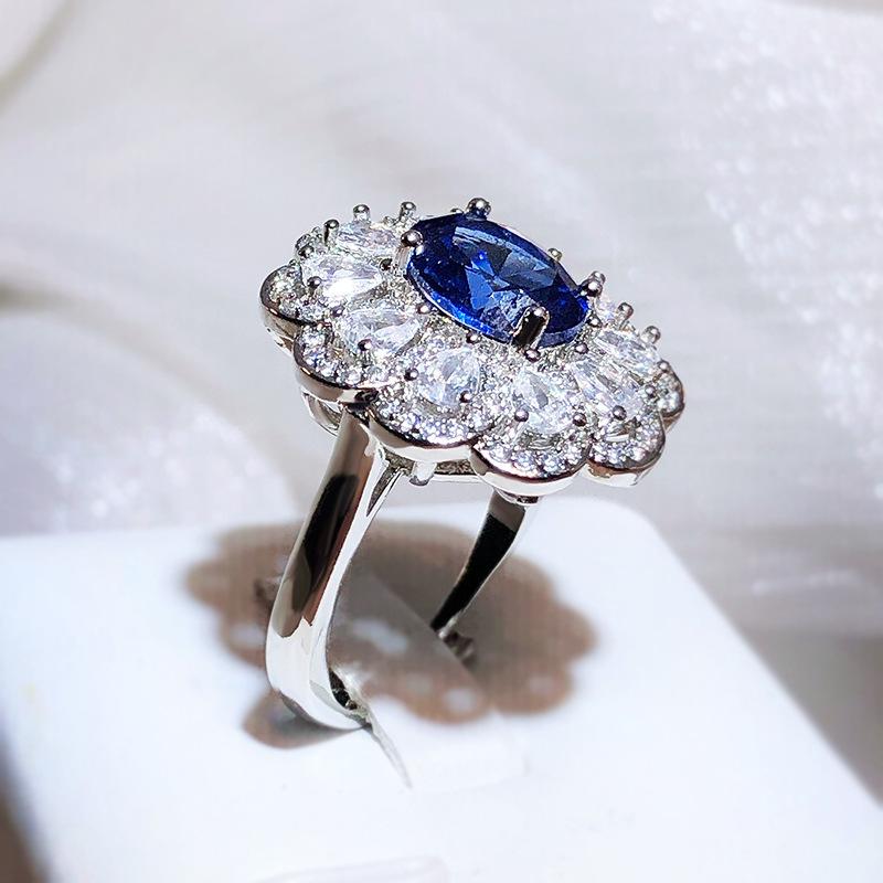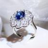 Novo High-end Luxo Oval Simulação Safira Aberto Flor Cabeça Anel Feminino Anel de Zircão