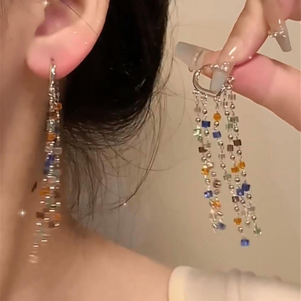 2023 Novos Brincos de Borla Quadrados de Cristal Coloridos para Mulheres Brincos Frescos Exclusivos Design de Nicho Mulheres Frisadas