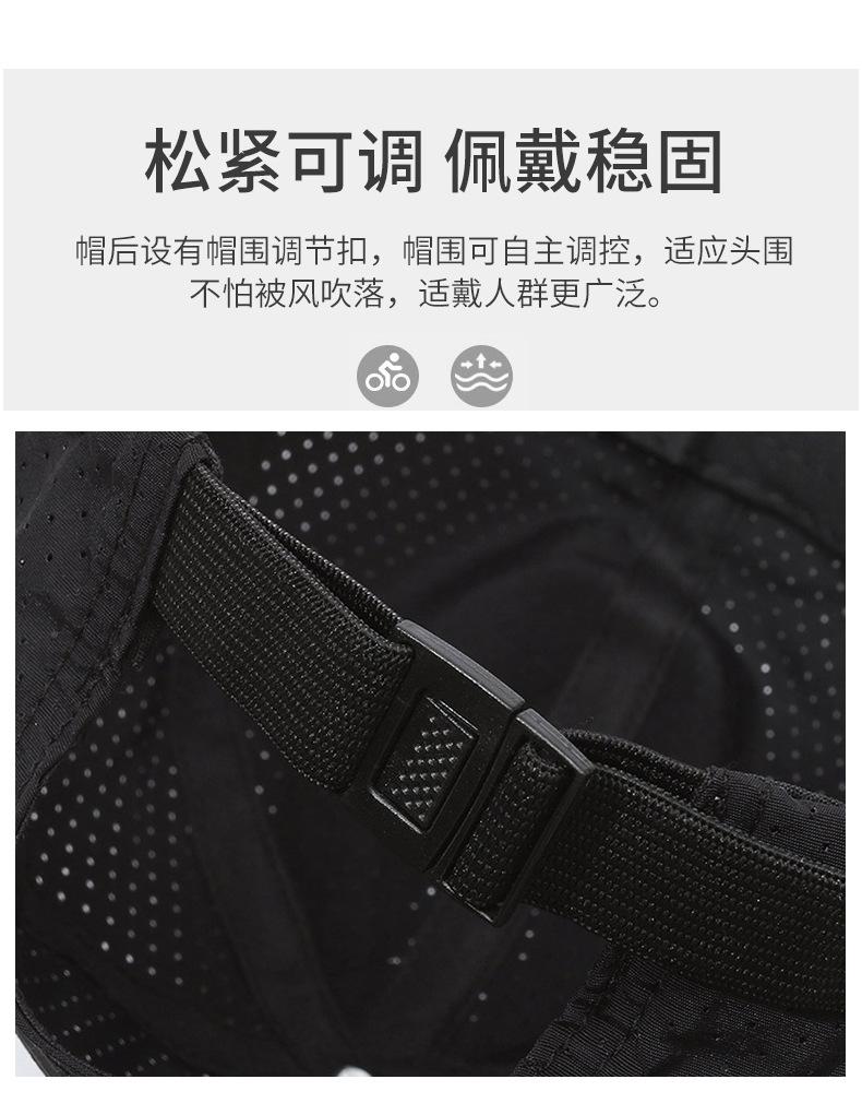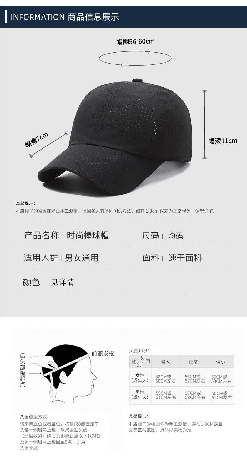 Este modelo é feito de tecido de secagem rápida, o comprimento da aba é de 8 cm, a circunferência é ajustável de 56 a 58 cm e o peso é de cerca de 58 gramas