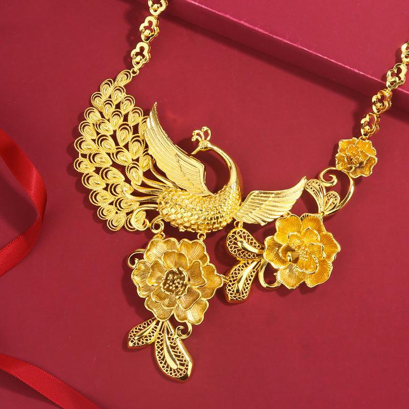 Noiva Jóias de Casamento Bronze Banhado a Ouro Phoenix Pendurado Enfeites Casamento Feminino Dupla Felicidade Dragão e Fênix Simulação Feminina Conjunto de Flores Banhado a Ouro