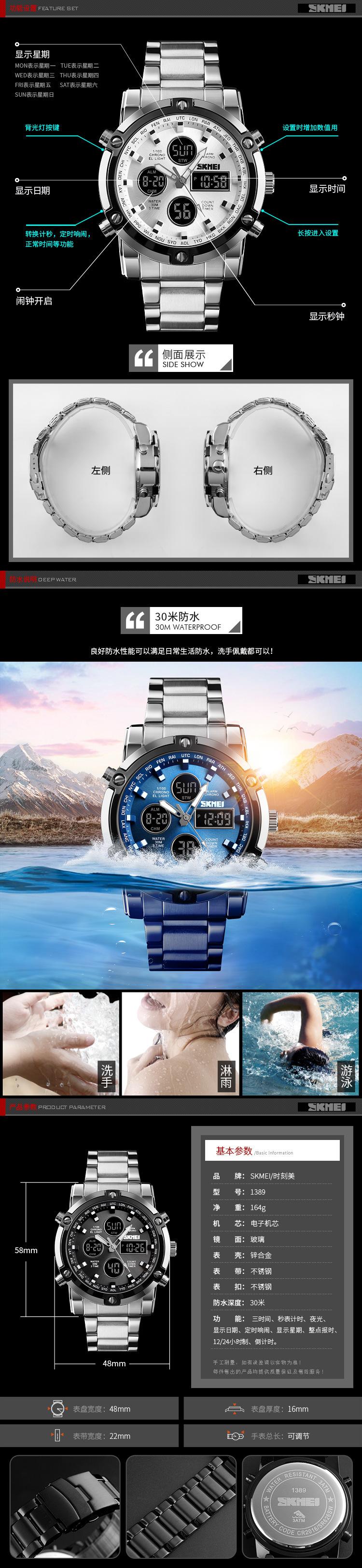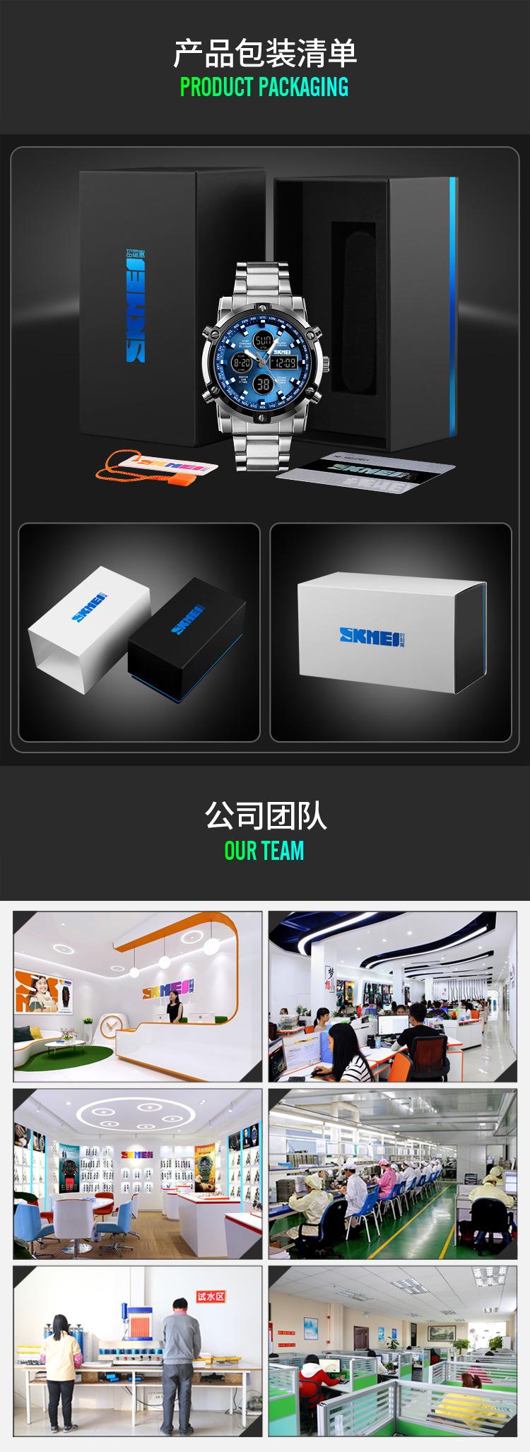 | Material | Caixa em liga de zinco, pulseira em aço inoxidável, espelho de vidro altamente transparente, tampa inferior em aço inoxidável, fivela em aço inoxidável |