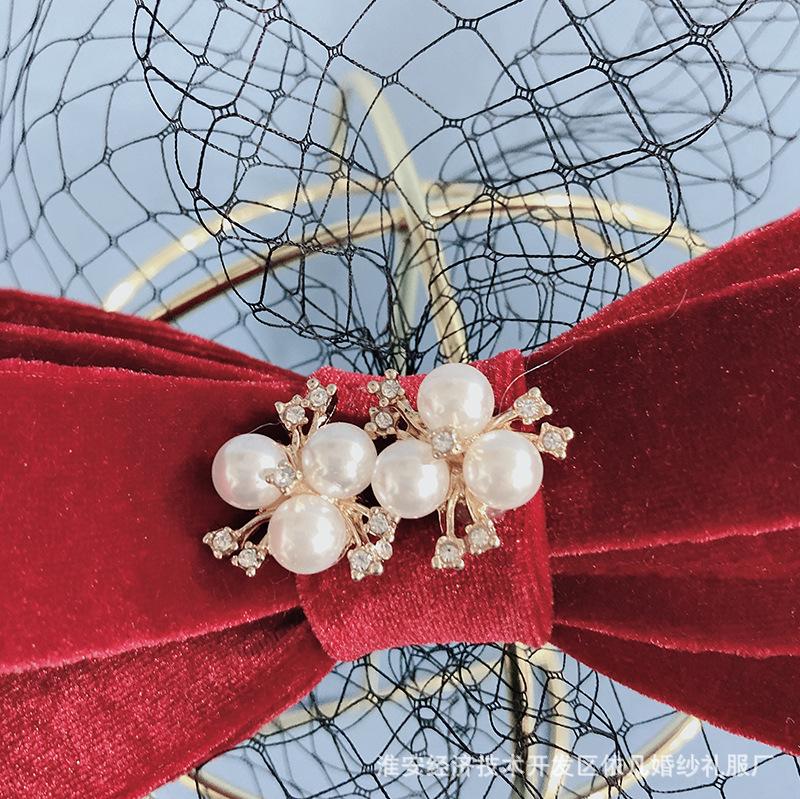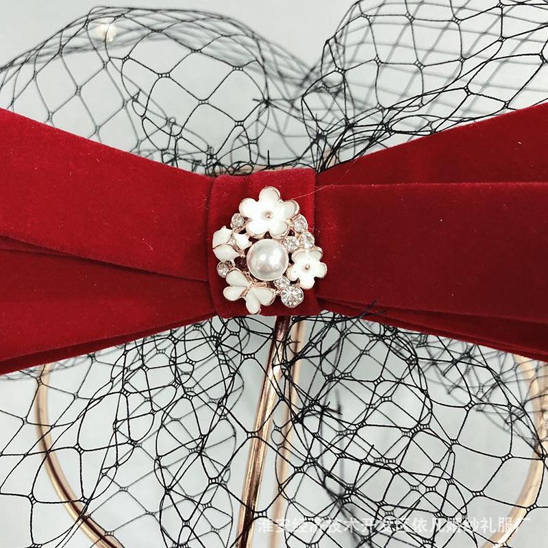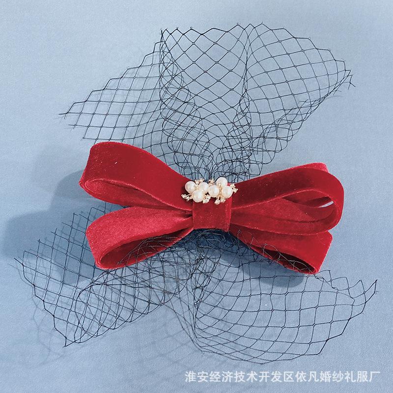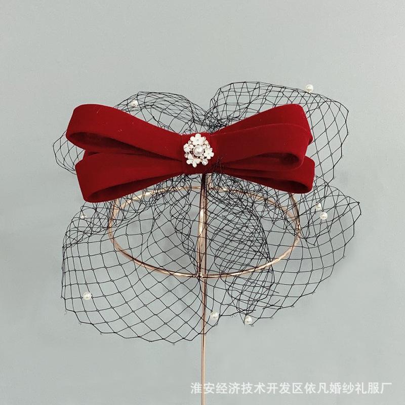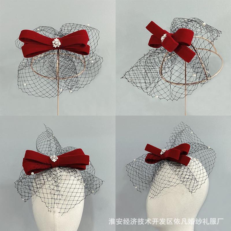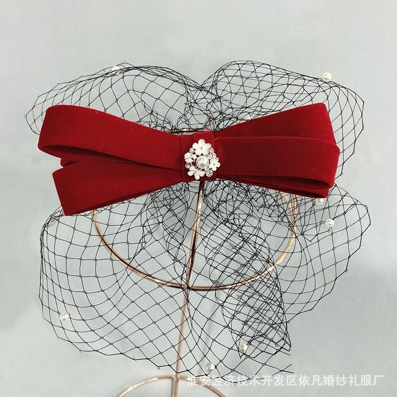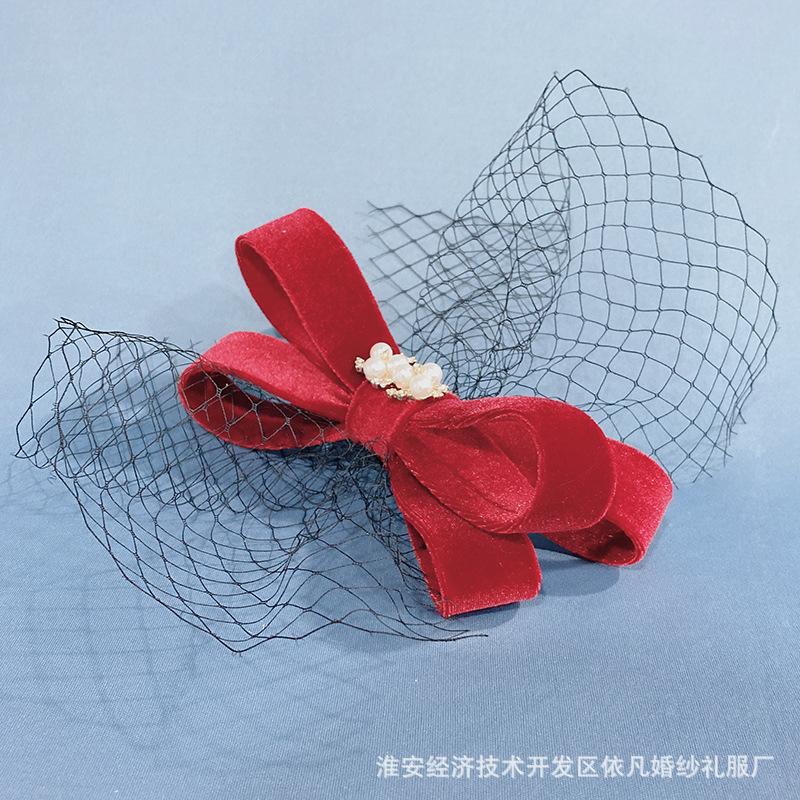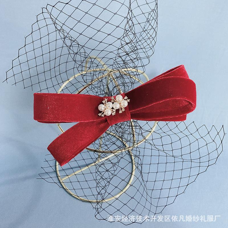 Fornecimento de fábrica Francês Vintage Veludo Bow Véu Vermelho Cocar de Noiva Vestido de Noiva Brinde Vestido Acessórios Cabelo