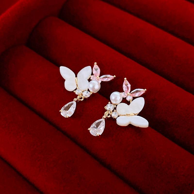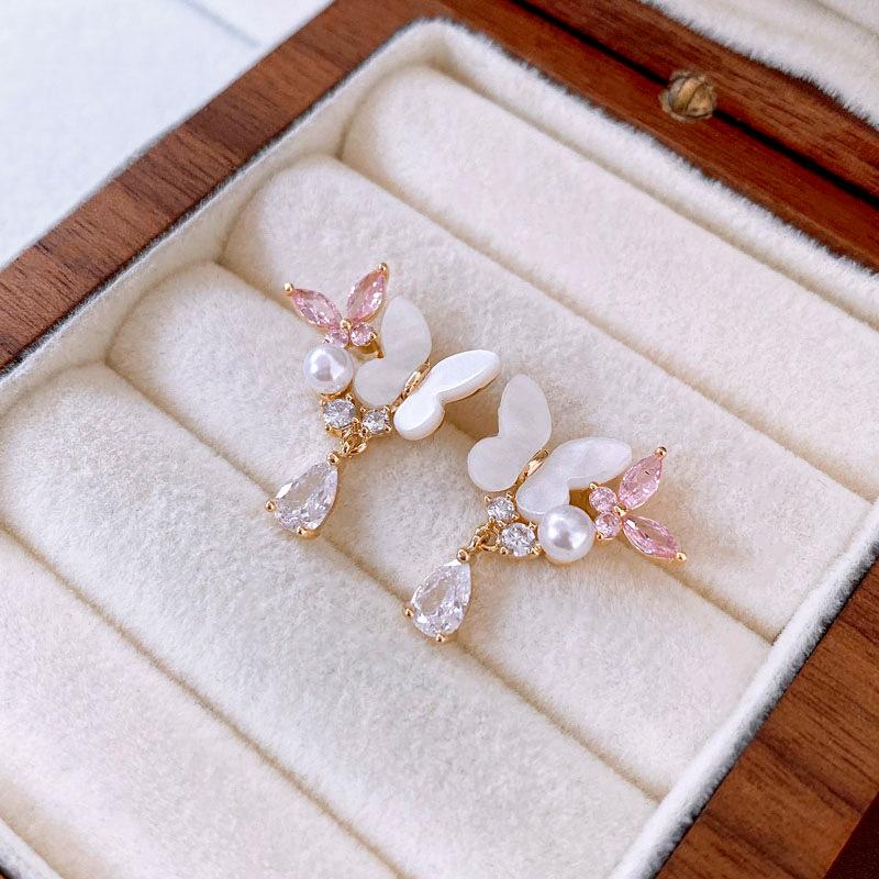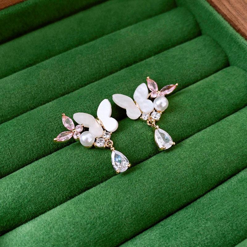 Brincos de prata com pingente de borboleta e zircônia, imitação de pérolas, elegantes e estilosos para mulheres