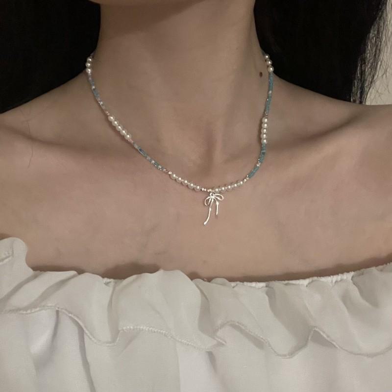 Doce Moda Cor Frisada Pérola Arco Pingente Colar Luz Luxo Elegante Cadeia de Clavícula de Alta Qualidade