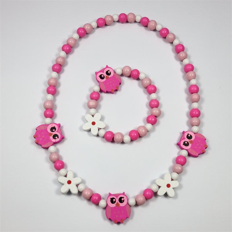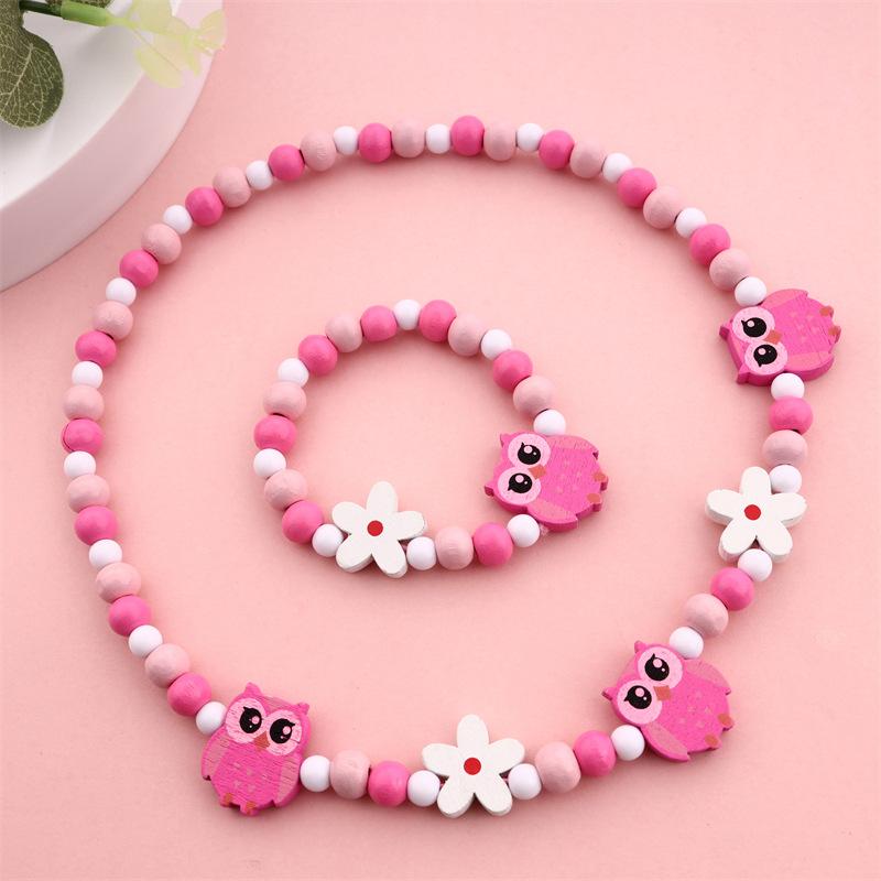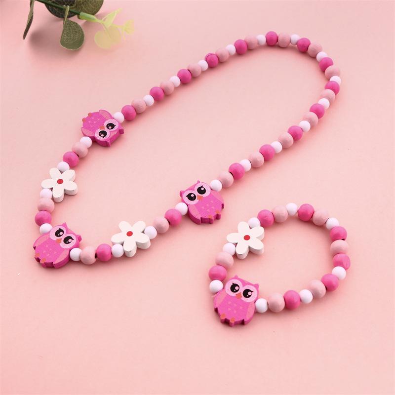 Conjunto Colar e Pulseira Coruja Colorida Fofa Contas de Madeira Infantil Desenho Animado Madeira DIY Contas de Colar Multicoloridas