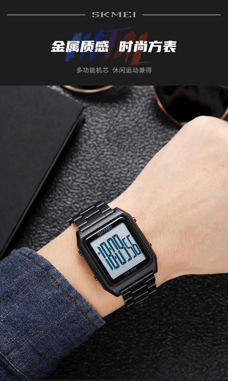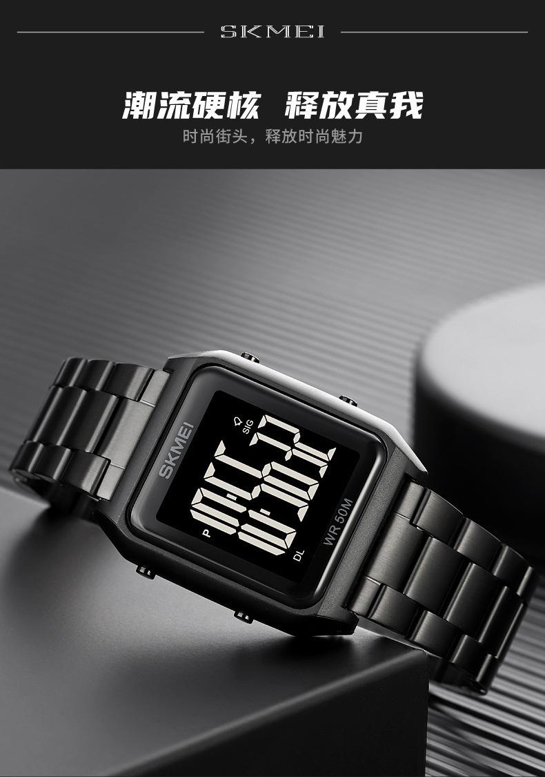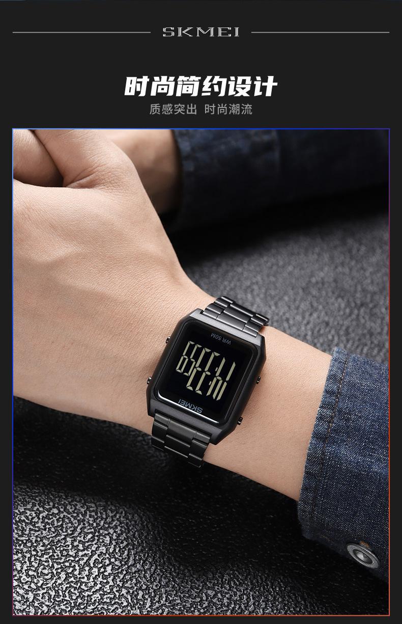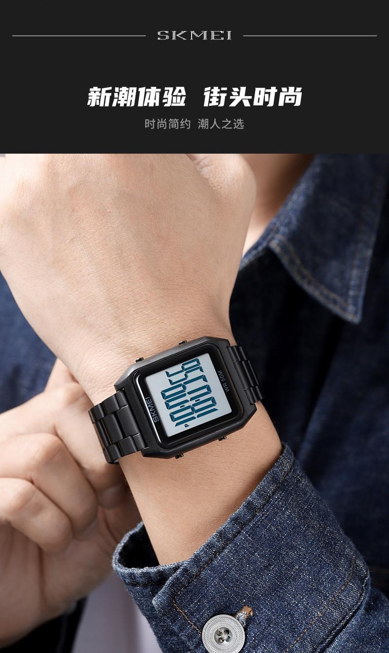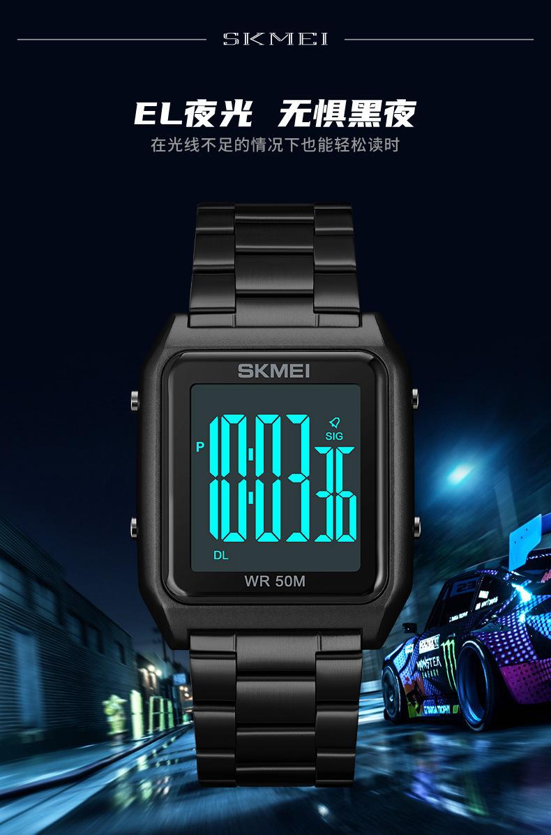Relógio eletrônico masculino de tela grande com pulseira de aço e relógio quadrado multifuncional de estudante