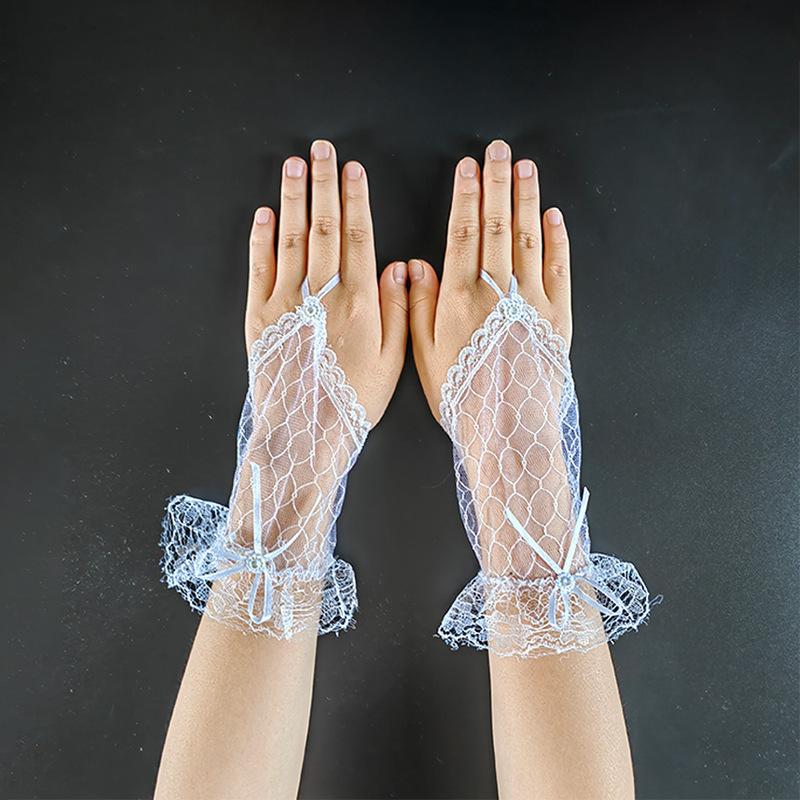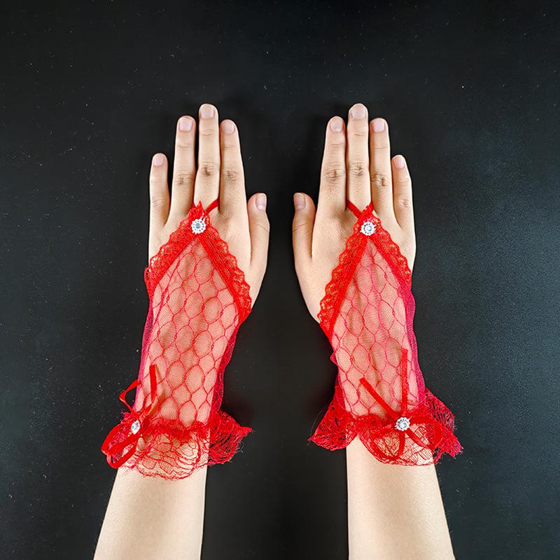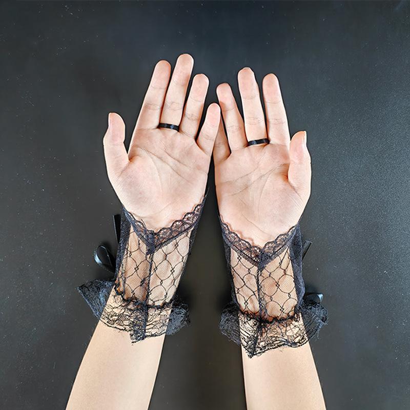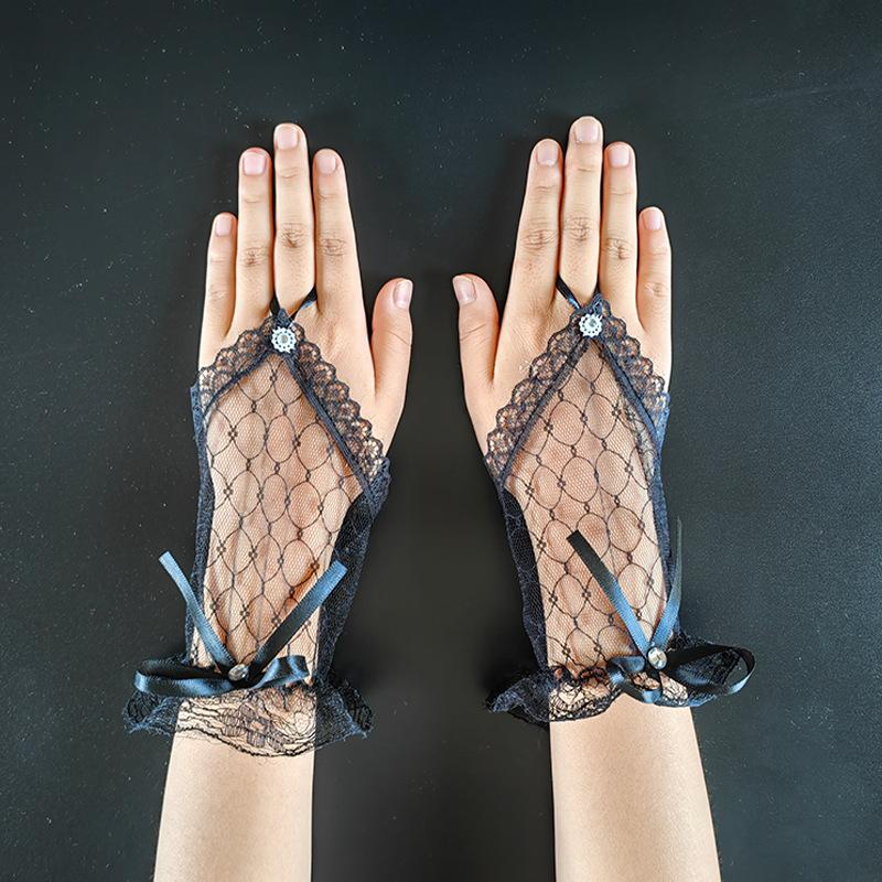 Vendas Diretas da Fábrica Luvas de Noiva para Casamento com Gancho de Dedo Pretas Curtas de Renda com Laço Mangas de Mão Estilo Retrô